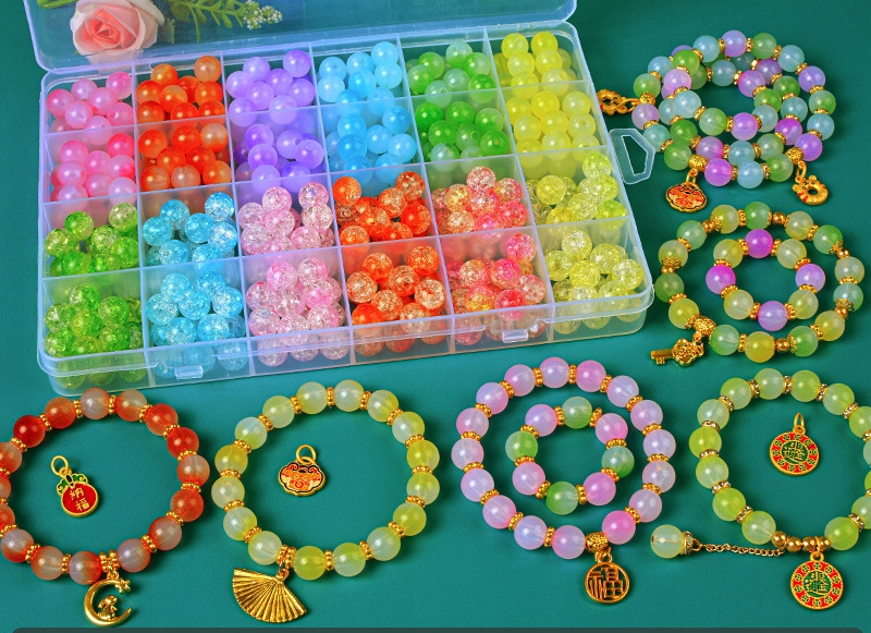 Набор круглых бусин для изготовления браслетов с фурнитурой в 12 цветах.