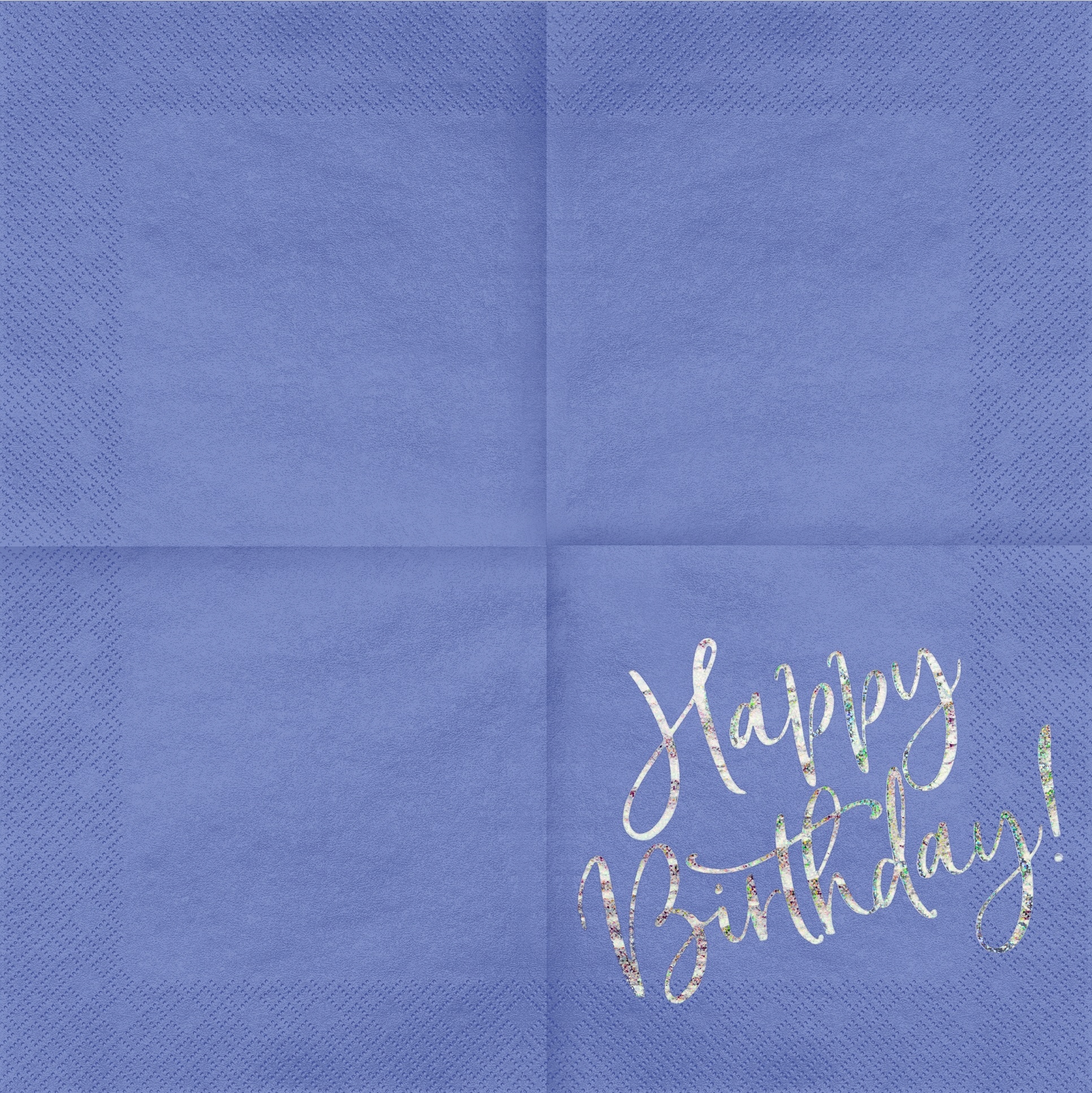 - 20 бумажных салфеток: Салфетки размером 33 см х 33 см в разложенном виде, темно-синего цвета с голографической надписью «С Днем Рождения!», добавят элегантности и практичности любому столу.