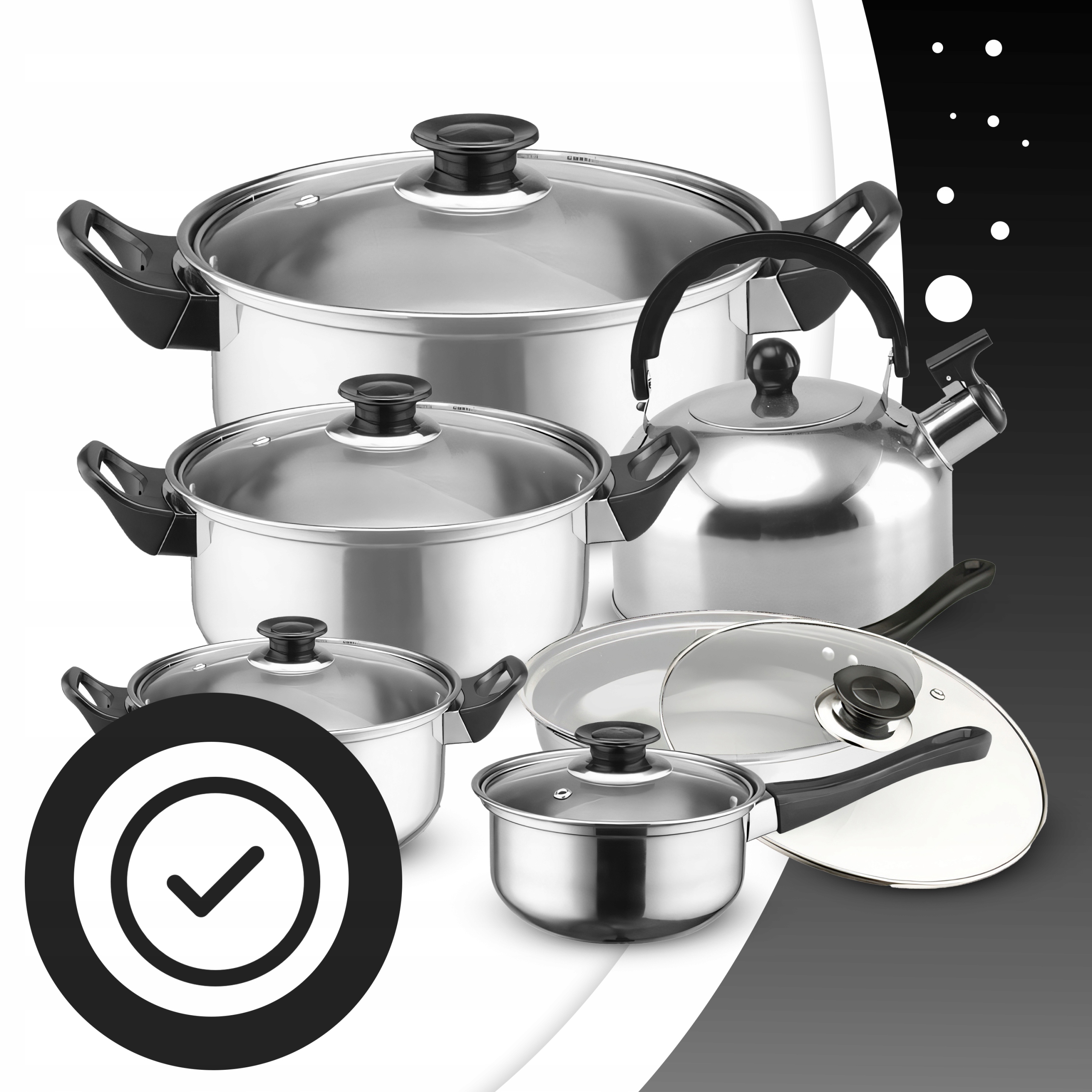 ⭐ Большой набор: Набор состоит из 11 элементов, включая горшки, сковороды, крышки и чайник, идеально подходит для оборудования любой кухни.