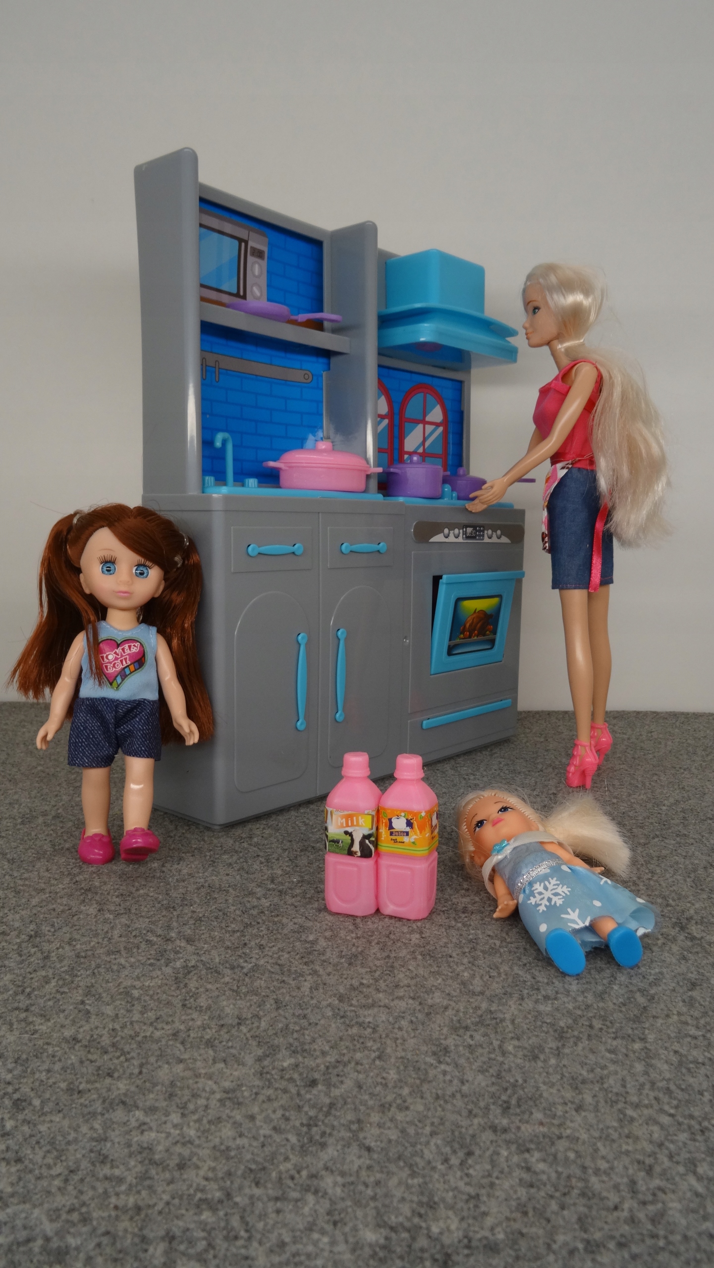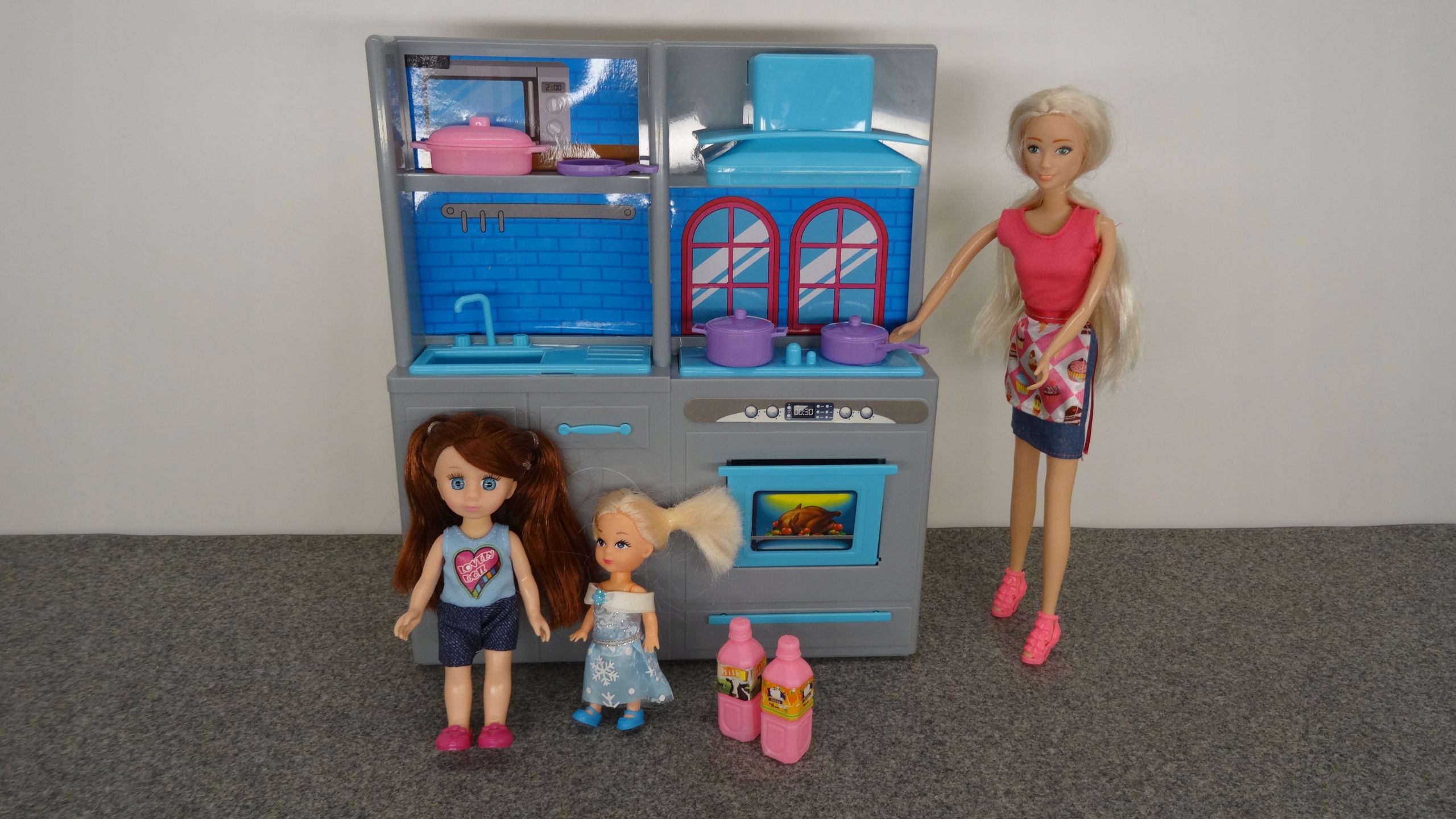 Набор игрушек: 3 куклы, включая Барби, кухня с посудой.