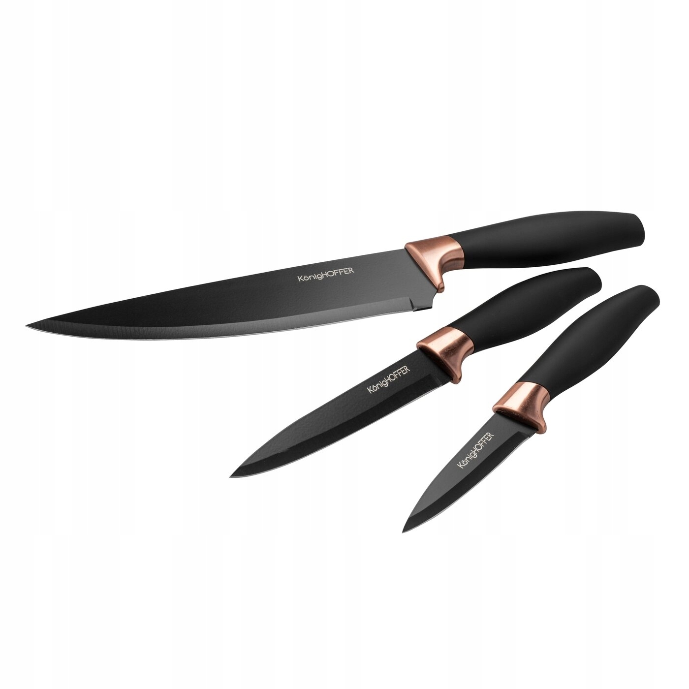 Набор из 3 кухонных ножей Konighoffer Dark подойдет для повседневного использования в каждом доме. С помощью универсального ножа можно быстро справиться, например, с приготовлением бутербродов и помидоров, которые нужно нарезать тонкими ломтиками. Нож для овощей и фруктов стоит использовать тогда, когда нужно качественно очистить или разделить яблоко на кусочки. Он также без проблем нарежет ингредиенты для салата. Благодаря этому нежные и мягкие ингредиенты не будут раздавлены. Самым большим (поварским) ножом можно обрабатывать жаркое, мясное ассорти, выпечку и рыбу. Его также используют для измельчения. Лезвия из высококачественной нержавеющей стали прочны и надежны. Они надолго сохранят остроту и обеспечат точность в работе. Они покрыты антипригарным покрытием, которое предотвращает прилипание продуктов. Ручки имеют профилированную форму и имеют мягкую на ощупь поверхность. Это значит, что они не скользят даже во влажных руках. Сочетание матового черного цвета и элементов, имитирующих розовое золото, придает комплекту элегантность и современный стиль.