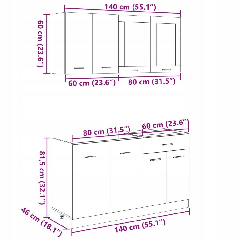 Этот комплект кухонных шкафов позволяет оптимизировать использование пространства на кухне, предоставляя достаточно места для хранения ваших вещей.