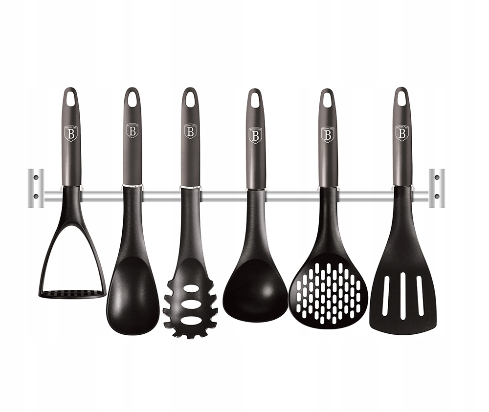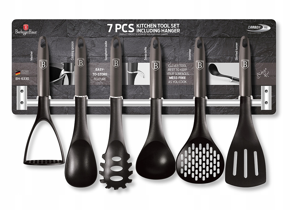 Набор нейлоновой кухонной утвари из 7 предметов от BERLINGER HAUS из линейки Carbon Pro Collection с практичной настенной вешалкой. Посуда особенно рекомендуется для посуды с керамическим и тефлоновым покрытием. Материал, из которого они изготовлены, не царапает поверхность посуды. Устойчив к высоким температурам до 210 градусов С. Обладает особыми антибактериальными свойствами.