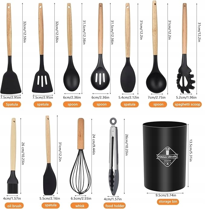 Комплект поставки: лопатка для сковороды, перфорированная лопатка, плотная ложка, пролитая ложка, скребок, ложка для супа, лопаточка для спагетти, масляная кисточка, лопаточка, венчик, подставка для еды, ведро для хранения.