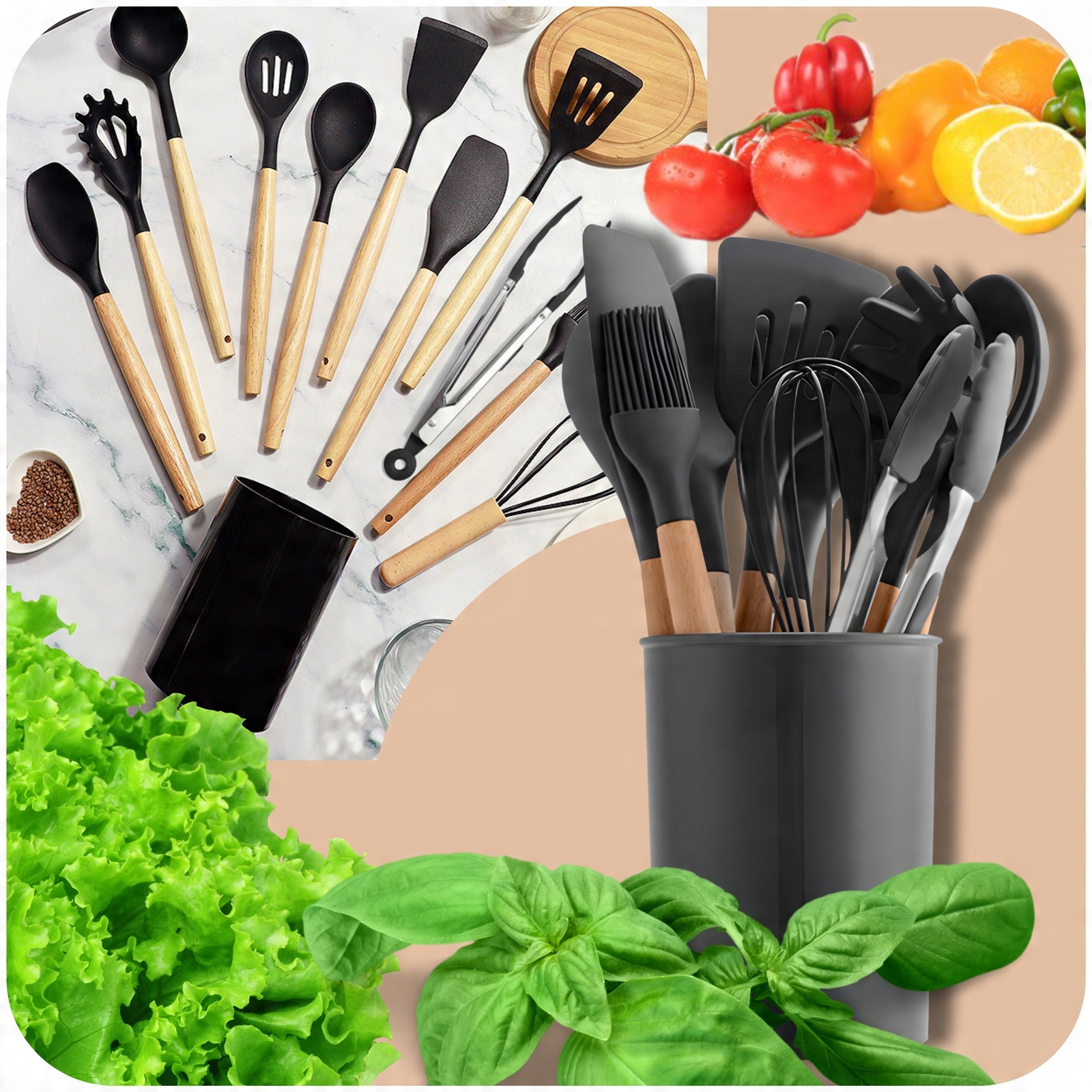 НАБІР КУХОННОГО ПОСУДУ СИЛІКОНОВИЙ ДЕРЕВ'ЯНИЙ КУХОННИЙ ПОСУД 12 ЕЛ