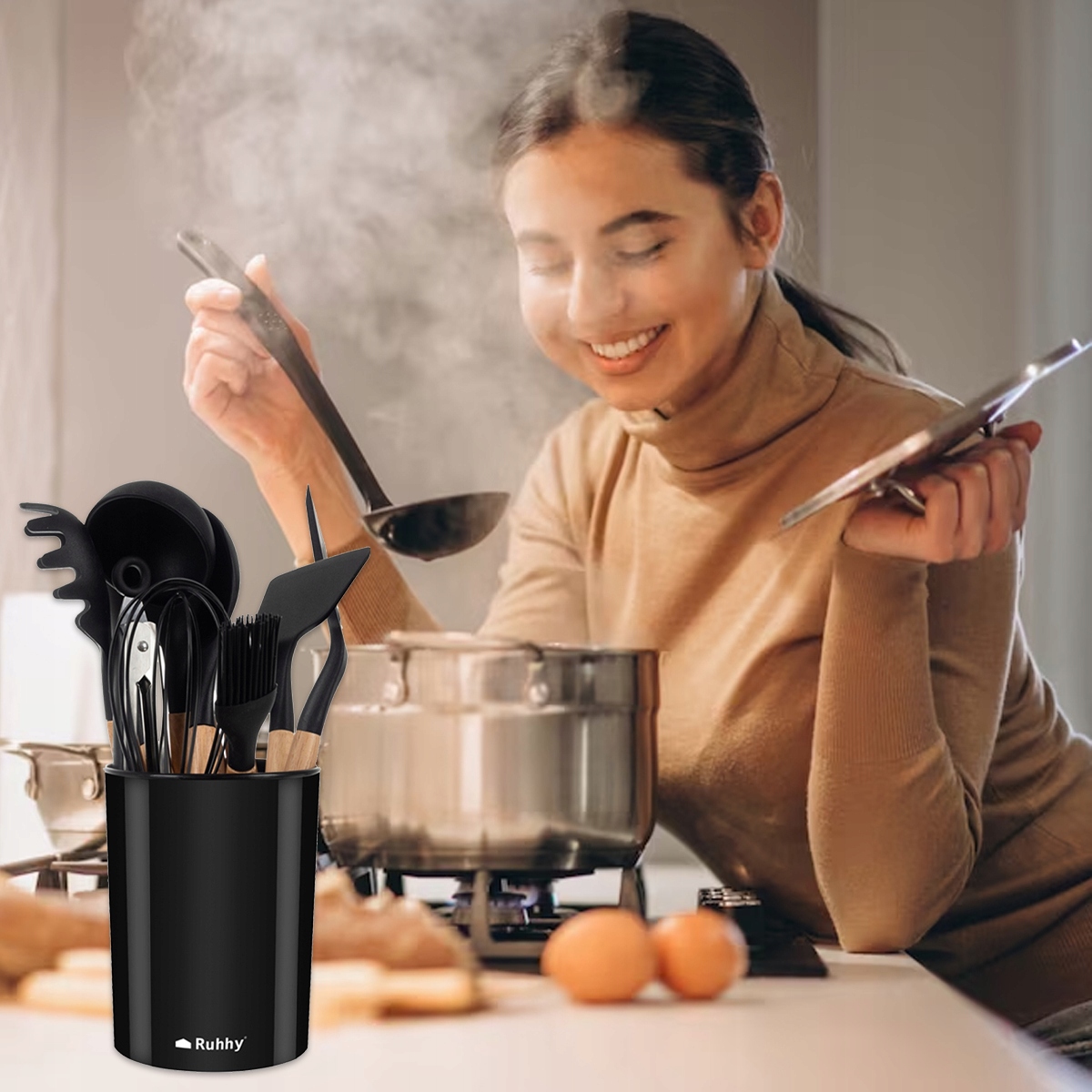В посуде есть отверстия для крючка, поэтому выбранные аксессуары можно повесить над плитой, а менее используемые положить в ящик для инструментов.