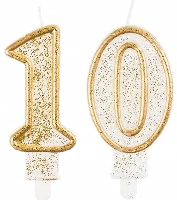 2x Свеча «1»+«0» на десятый день рождения, десять лет; золото с блестками/глиттер