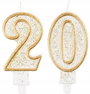 2 х Свеча «2»+«0» на 20-летие свадьбы, ; золото с блестками/глиттер