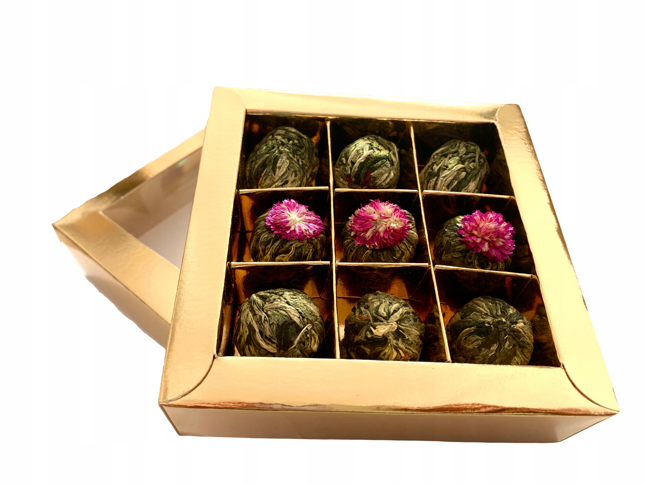 Чайный сервиз «Цветущий» в коробке с окошком – идеальный подарок для любителей чая. Набор состоит из 9 чайных шариков, которые, брошенные в горячую воду, начинают нежно цвести, создавая прекрасное зрелище, каждый чай сделан вручную, а он содержит натуральные ингредиенты, такие как сушеные цветы и чайные листья.