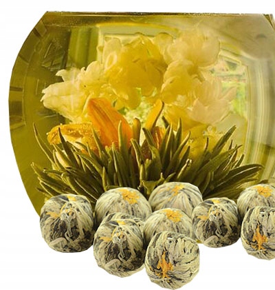Что такое цветущие чаи? b> Их оригинальное название происходит от китайского 工艺茶 и означает чайные шарики или, как некоторые предпочитают переводить, шарики счастья. Ручная работа китайских чайных мастеров, сочетающая в себе высококачественный чайный лист с сухоцветами, травами и специями. Перед сушкой заранее сформированный букет чая и цветов очень плотно сворачивают, а затем сушат. Шарик твердый и не похож на обычный чай, что, конечно, меняется, когда мы заливаем такой чайный шарик теплой водой. Под воздействием температуры чайная жемчужина начинает величественно набухать и медленно развиваться, чтобы окончательно зацвести, отсюда и ее польское название - цветущий чай. Мы также можем найти его под другими названиями, такими как: чайные шарики, чайные ложки, чайные букеты, цветущие чайные жемчужины, скрученные чайные бутоны или на английском языке цветущий чай и цветущий чай .