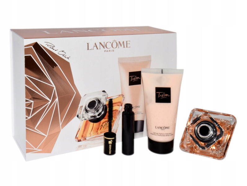 В подарочный набор входят парфюмированная вода LANCOME TRESOR 30 мл, парфюмированный лосьон для тела 50 мл и мини-тушь Hypnose 2 мл. Ноты аромата: сирень, роза, гелиотроп, ландыш, персик, лилии, ирис, абрикос, амбра, ваниль, сандал, мускус.