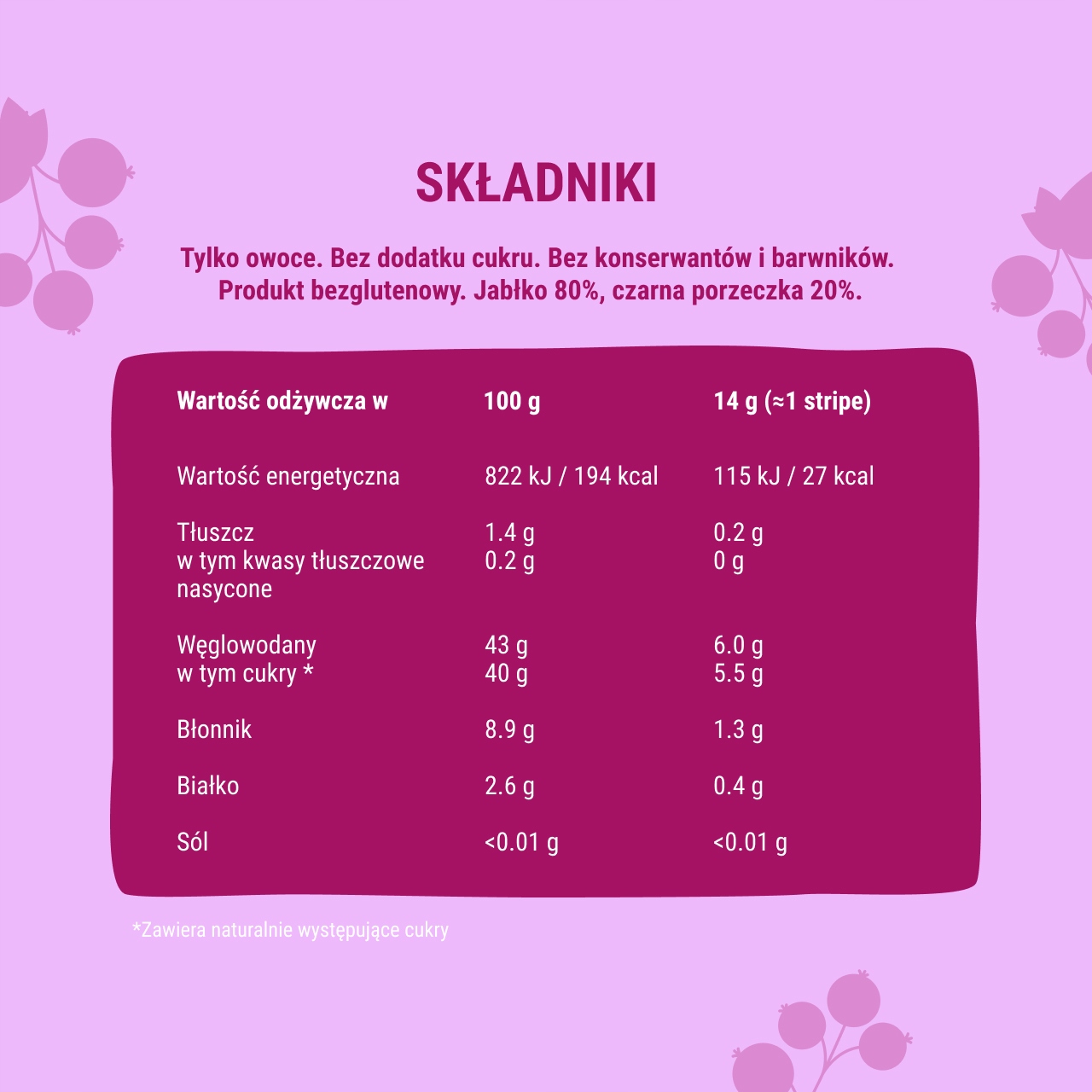 - Чистый состав. Стрипы имеют 100% натуральный состав. Это просто фрукты и ничего больше! Они всегда изготавливаются без добавления сахара, консервантов и красителей. Они не содержат глютена и ГМО.