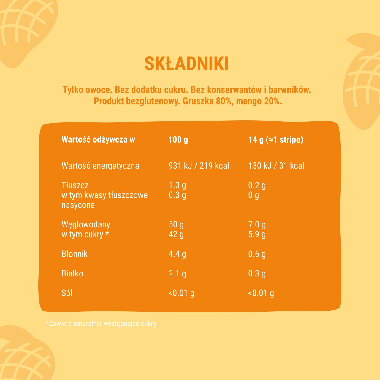 - Чистый состав. Полоски имеют 100% натуральный состав. Это просто фрукты и ничего больше! Они всегда изготавливаются без добавления сахара, консервантов и красителей. Они не содержат глютена и ГМО.