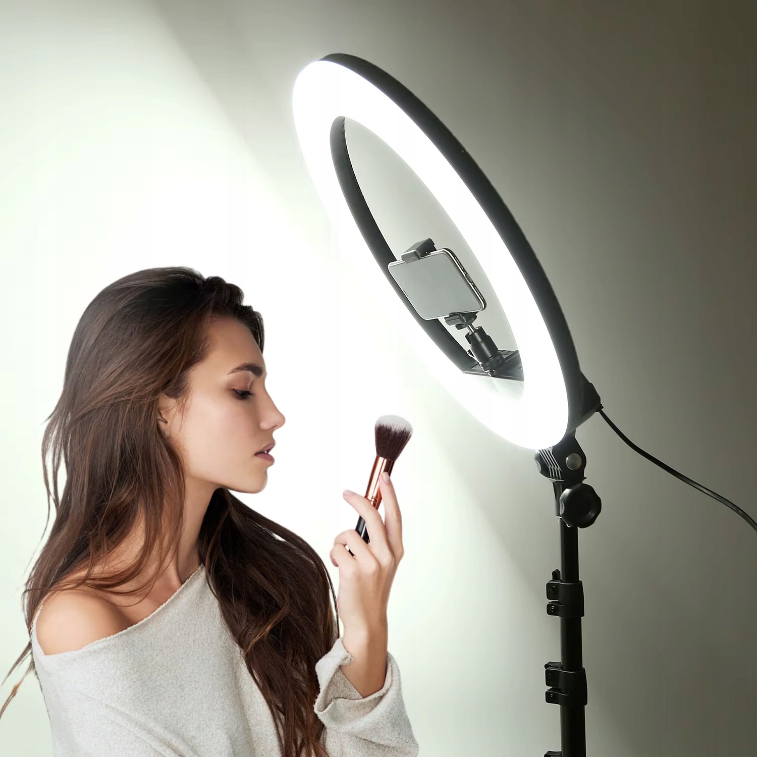 Кольцевая лампа диаметром 45 см генерирует сильный, равномерный свет, который устраняет тени и подчеркивает естественные черты лица, а также обеспечивает широкий диапазон освещения с регулируемым цветом и яркостью.
