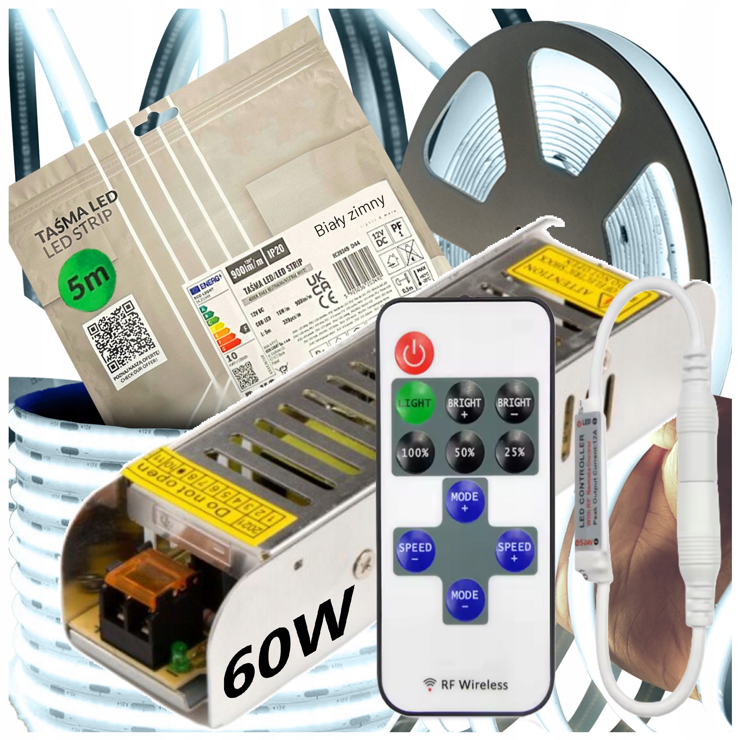 Набор светодиодных неоновых полос COB 12 В 5 м 6000 К ХОЛОДНЫЙ БЕЛЫЙ БЛОК ПИТАНИЯ 60 ВАТ РЧ ДИСТАНЦИОННЫЙ