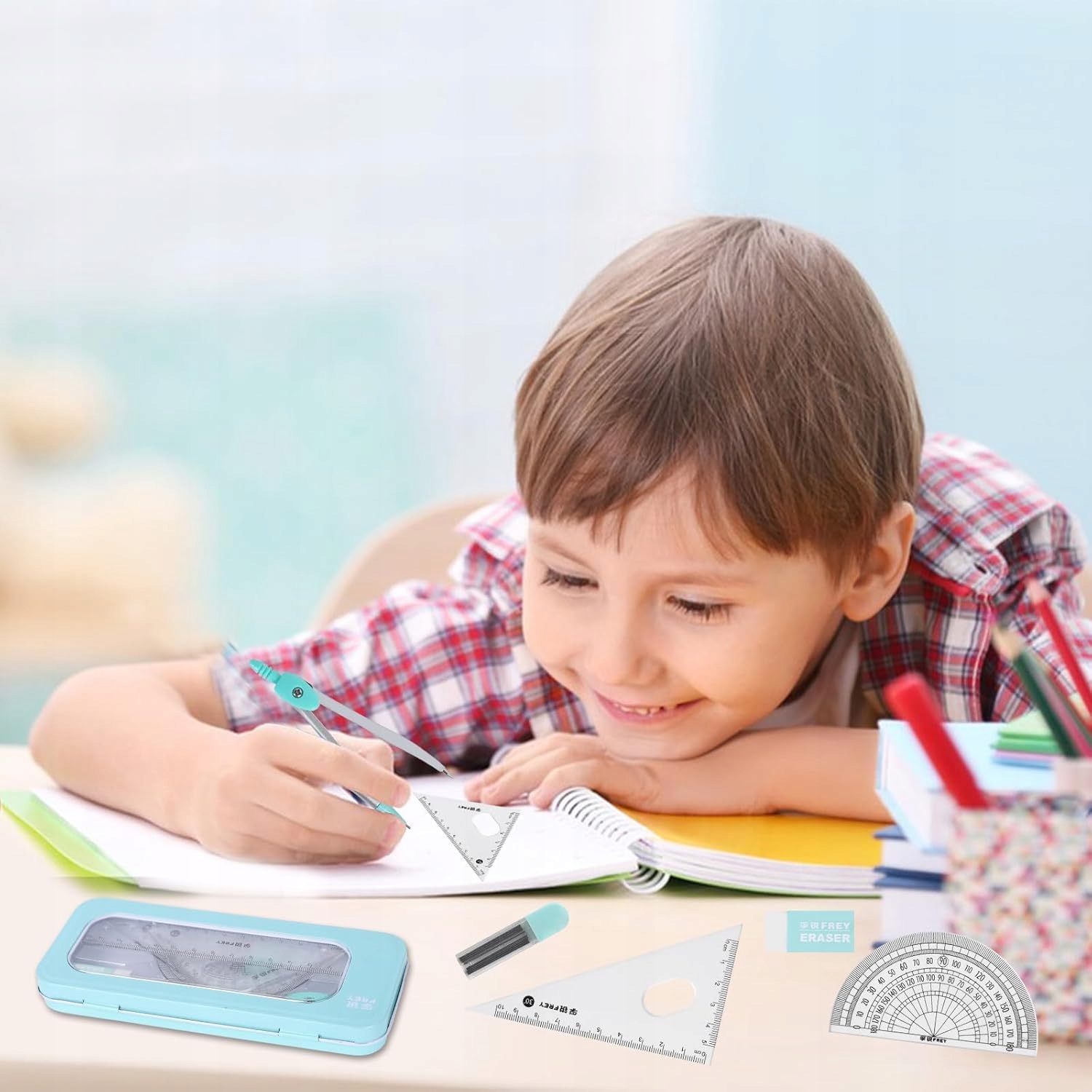 - один шаг набор: содержит стандартный набор математических инструментов с семью частями, который включает в себя металлический компас, эластичная полоса, 0,7 мм запасной ящик, линию длиной 15 см, угловой, прямоугольный треууриант 45 ° и прямоугольный триангл 30 °.