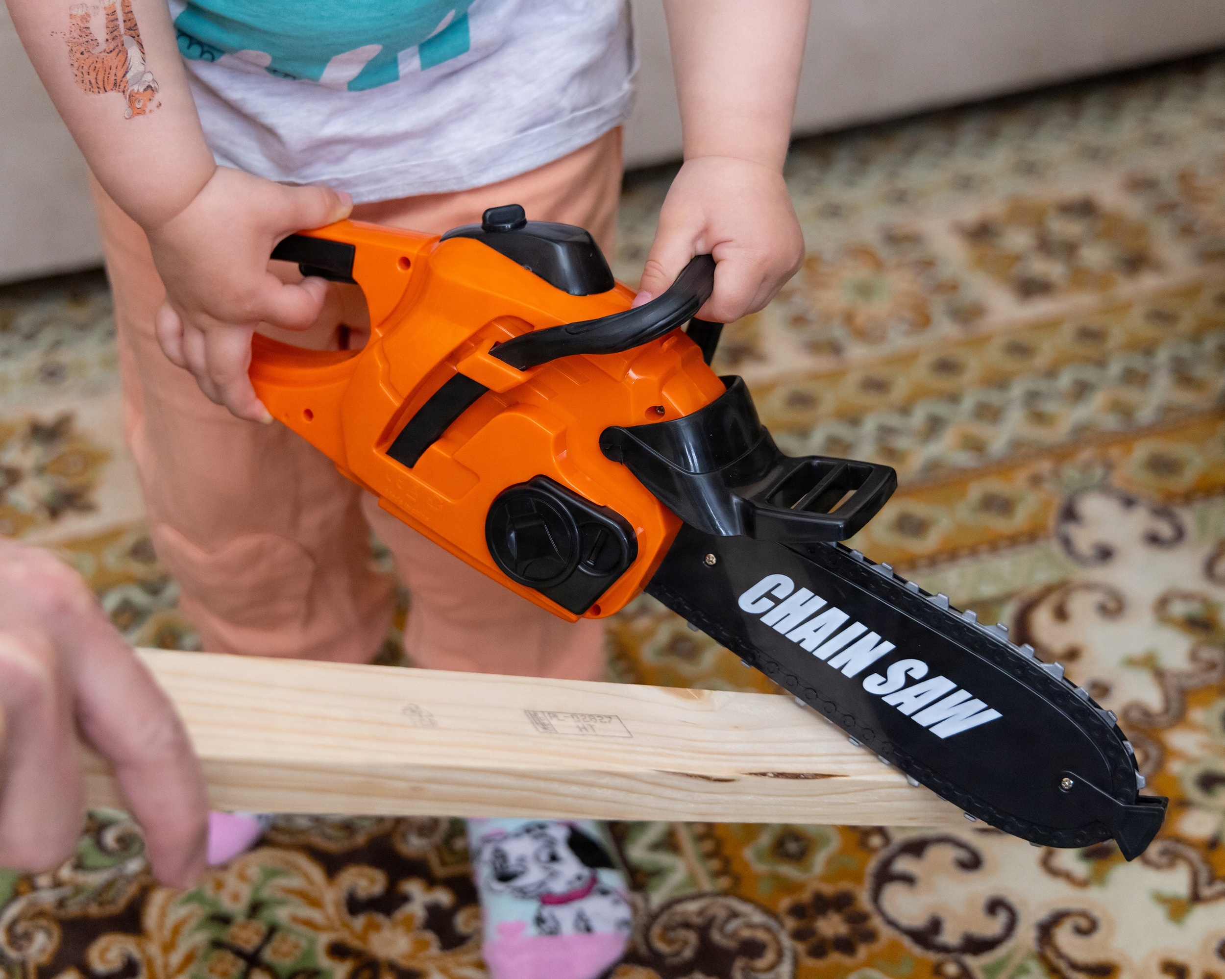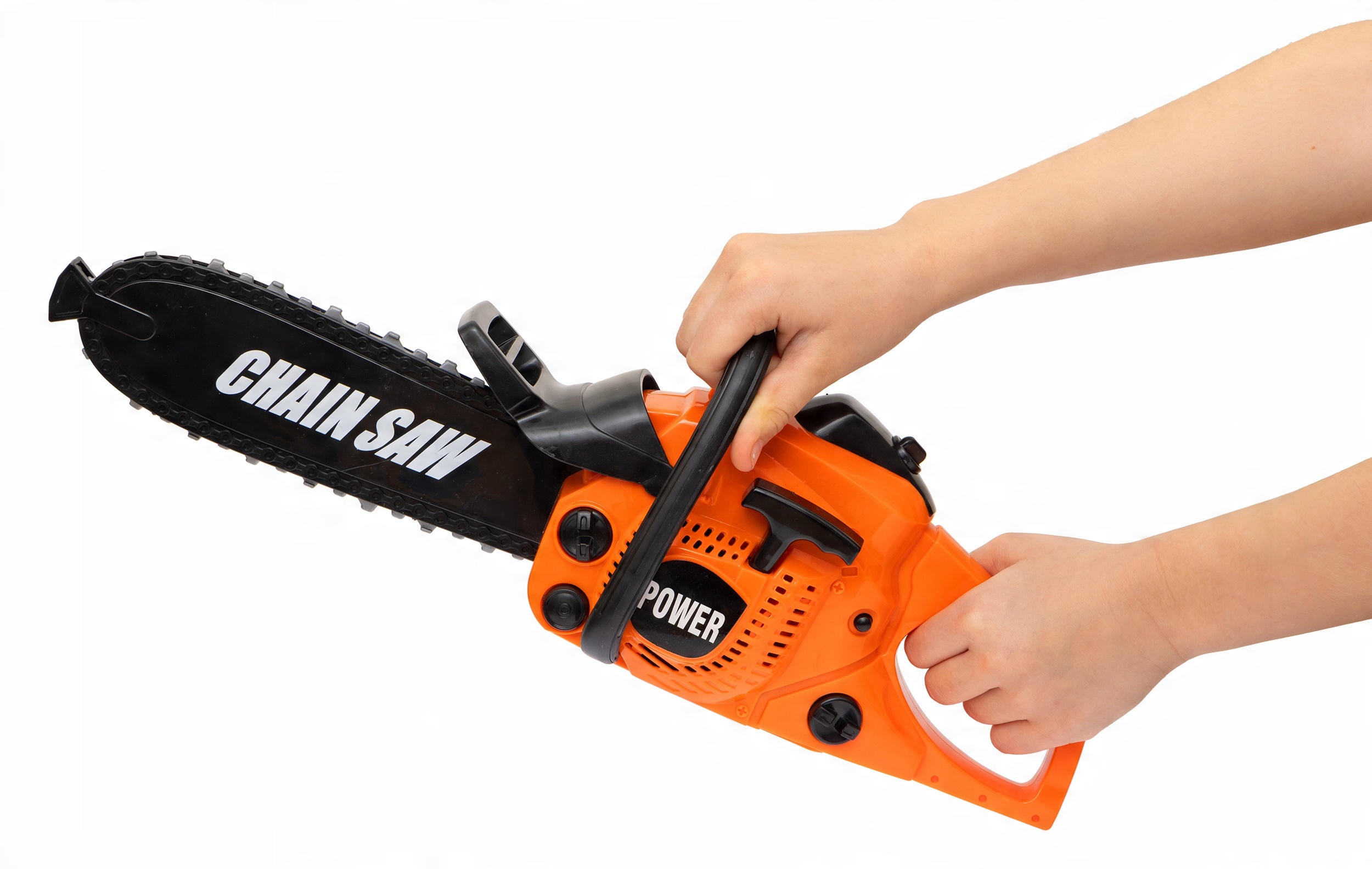 Игрушечная бензопила 100 % безопасна для детей. Вращающаяся цепь детской игрушечной бензопилы изготовлена из резины - нет риска, что ребенок поранится каким-либо элементом, и играть с ней можно в полной безопасности. Детская бензопила имеет очень удобную ручку, поэтому даже «долгочасовая работа на лесопилке» не утомит. Размер детской бензопилы и небольшой вес позволяют ей идеально помещаться в маленькой детской руке.