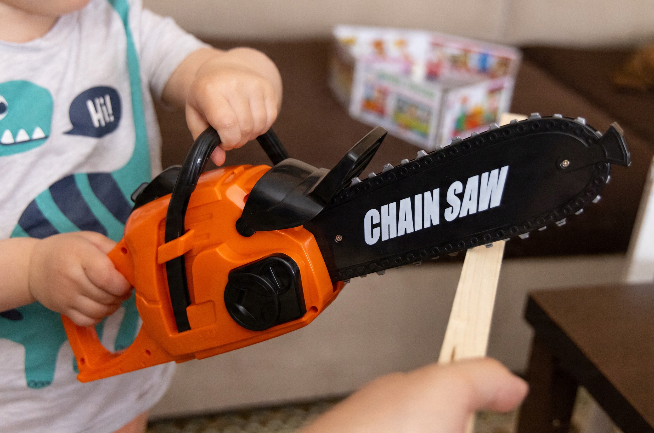 Бензопила для детей даже заводится как настоящая! После включения игрушки кнопкой ВКЛ/ВЫКЛ потяните пусковую ручку сбоку, а затем нажмите переключатель вращения в ручке. После выполнения этих действий цепь в игрушечной бензопиле начнет вращаться, а игрушка начнет издавать реалистичные звуки двигателя. Игрушечная моторная пила развивает воображение ребенка и дает ему почувствовать себя взрослым, выполняющим важную работу. Прекрасные и творческие развлечения с бензопилой для детей разовьют интересы каждого маленького лесоруба.
