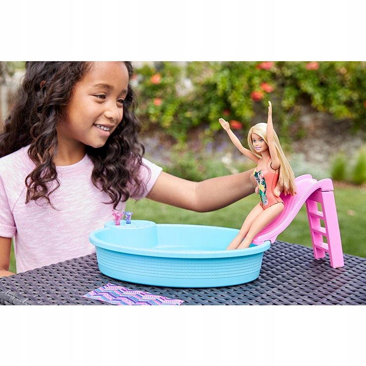 Бассейн легко наполнить водой (и опорожнить после игры), в нем есть место для Барби, ее сестрам или друзьям (остальные куклы продаются отдельно).