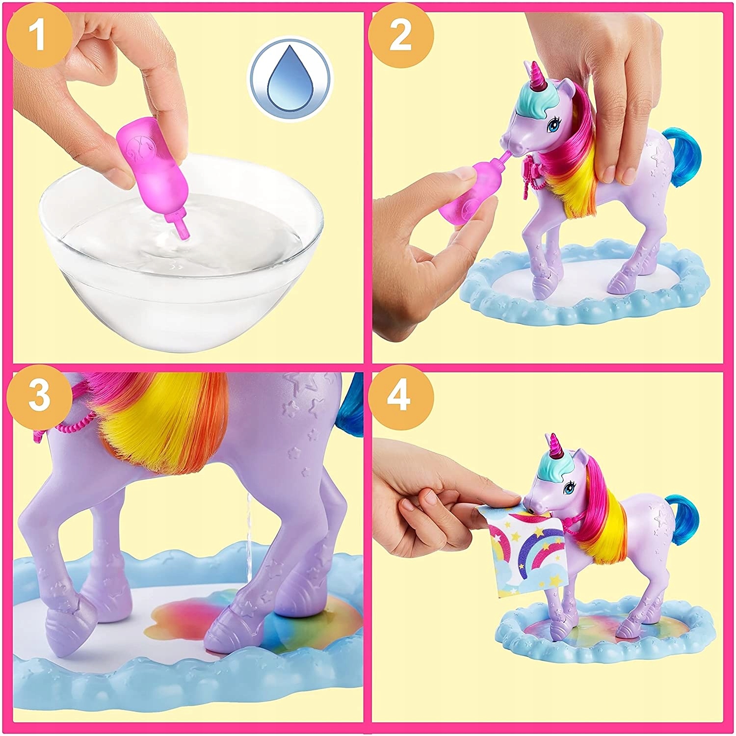 Когда поверхность высохнет, творческая игра может начаться снова. Другие аксессуары включают в себя кормушку и закуски, расческу для куклы Барби, щетку для ухода за ее единорогом и 10 аксессуаров для волос, которые помогут легко рассказывать истории и укладывать их.