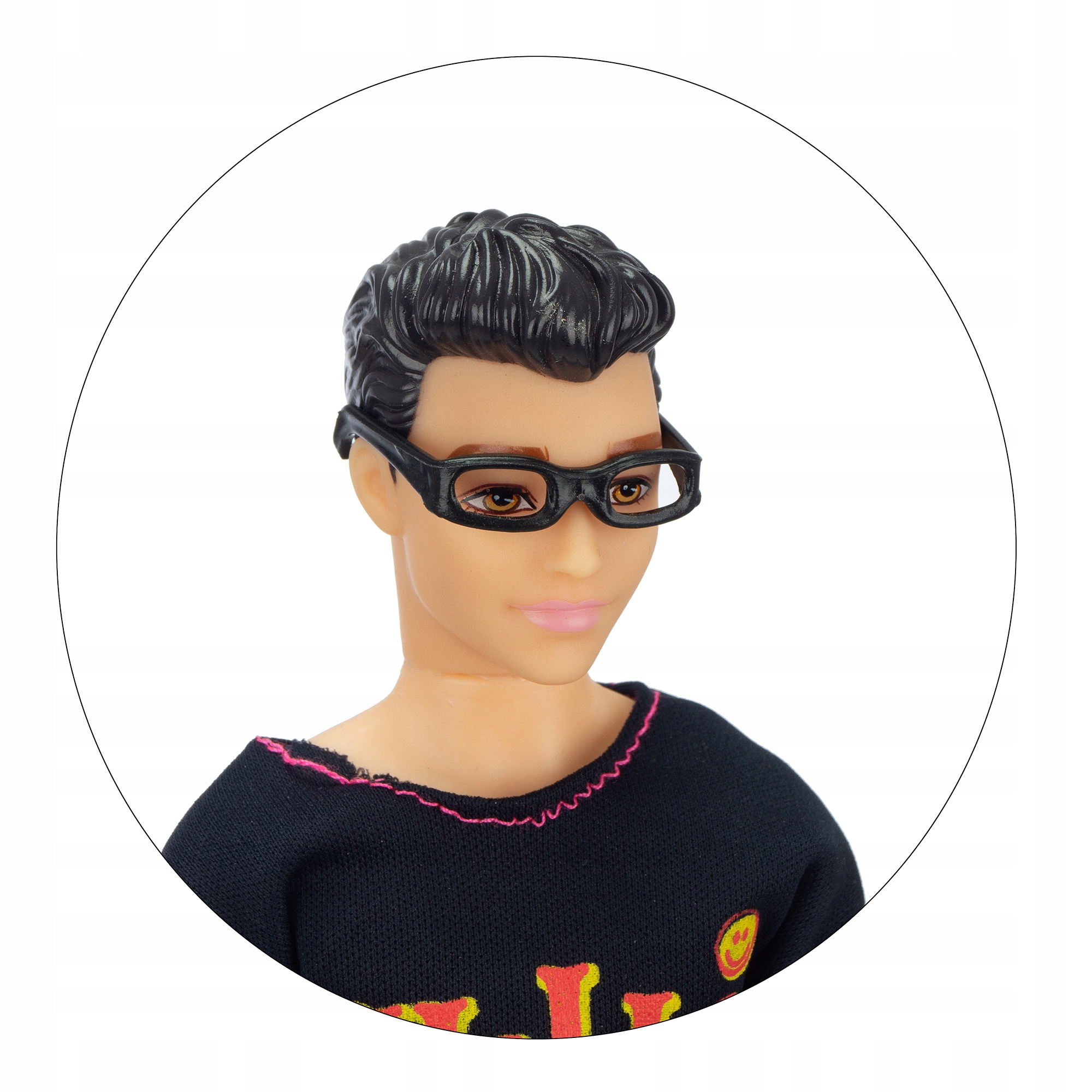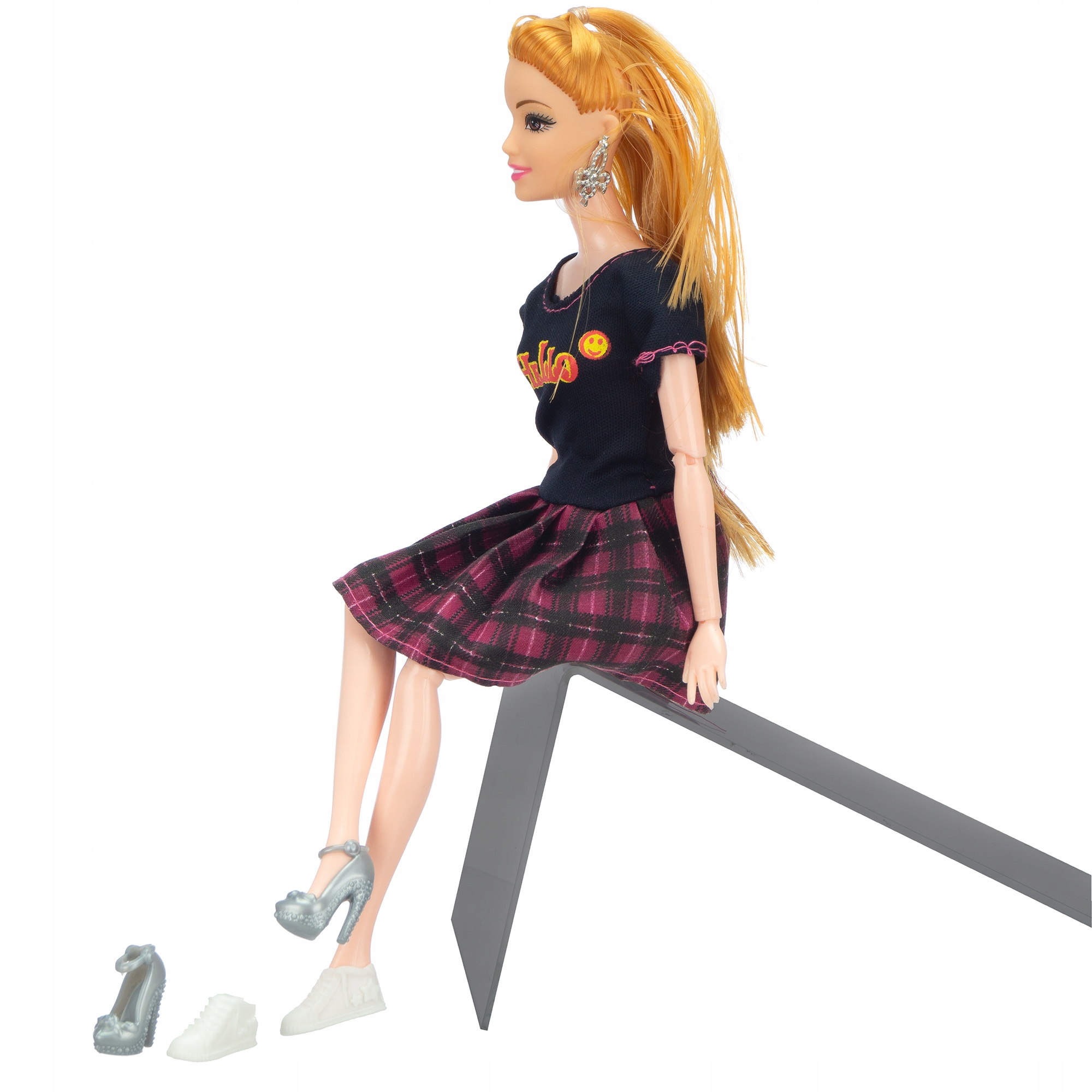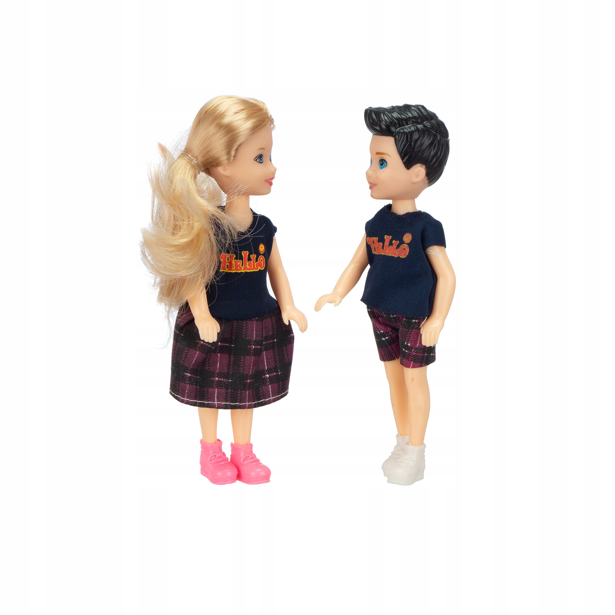 В комплект входят двое детей, двое взрослых, сумочка, шапка, очки, зеркало и расческа, а также туфли на высоком каблуке.
