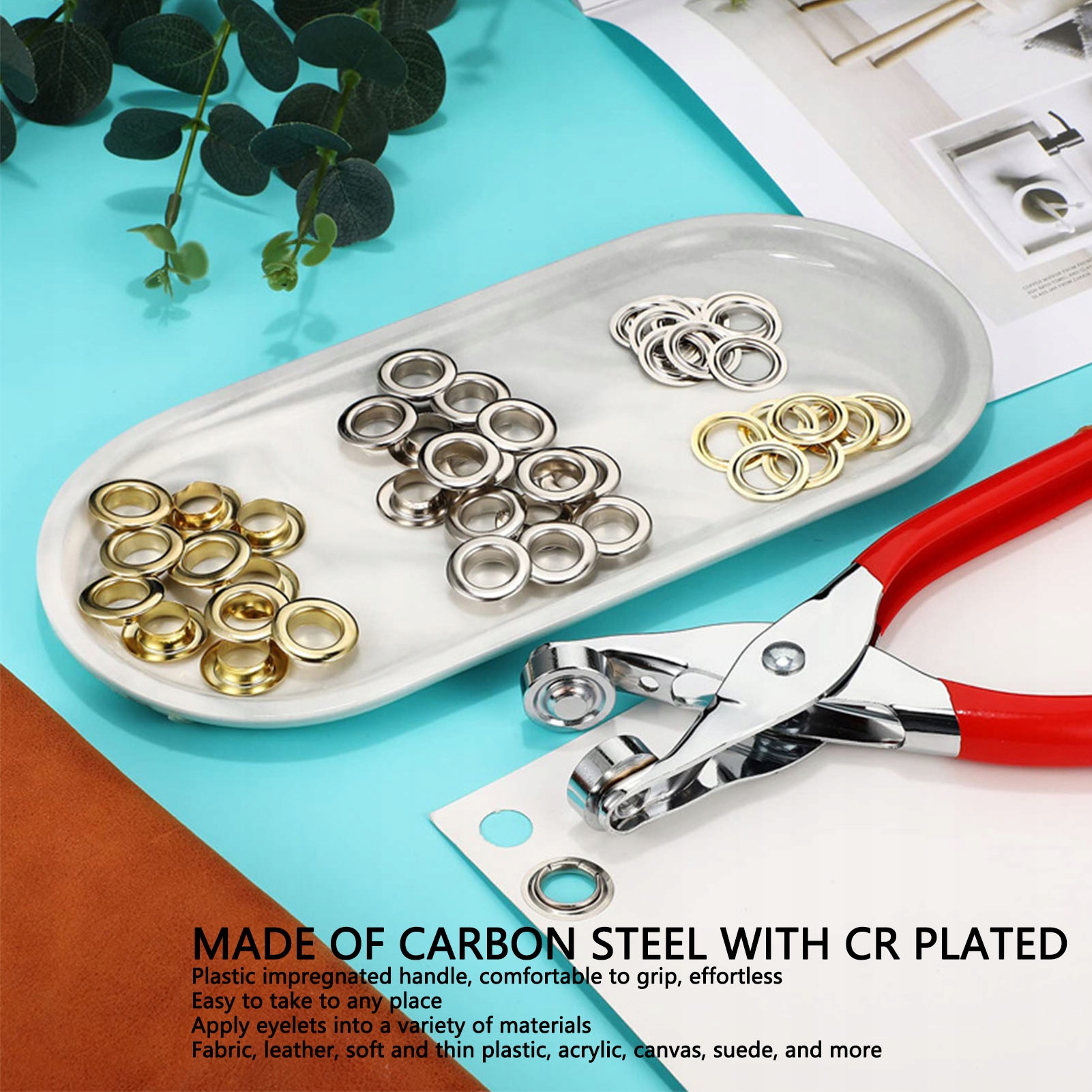 5. ПОРТАТИВНЫЕ, ЛЕГКИЕ РУЧНЫЕ ЩИПЦЫ ДЛЯ ГЛАЗ: Эти щипцы для глаз имеют специальную легкую конструкцию и изготовлены из углеродистой стали с хромовым покрытием. Ручка пробойников пропитана пластиком, благодаря чему ее удобно держать, легко использовать и не требует усилий. Легко взять с собой куда угодно. Щипцы для петель позволяют прикреплять петельки к различным материалам, таким как ткань, кожа, мягкий и тонкий пластик, акрил, холст, замша и т. д.