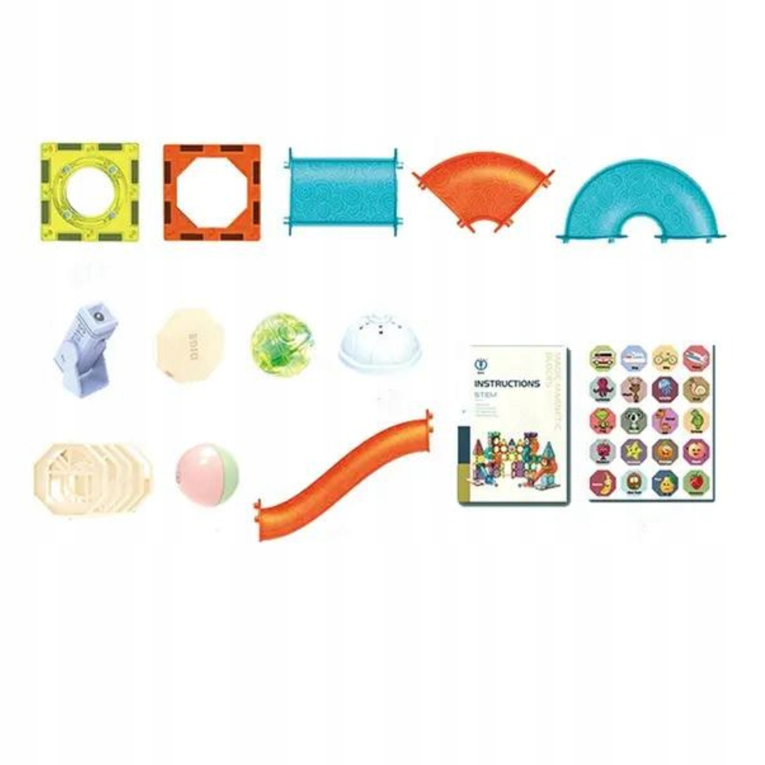 Набор состоит из 49 элементов. Некоторые блоки освещены, , что еще больше побуждает малыша играть и вызывает его любопытство. Набор также включает в себя инструкции для того, какие модели могут быть созданы с помощью набора, и лист со специальными наклеек. Блоки идеально адаптируются к маленьким рукам детей. Магнитные блоки очень весело не только для детей, но и для всей семьи!