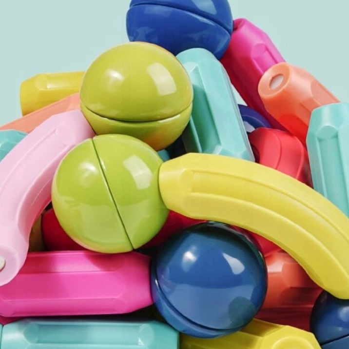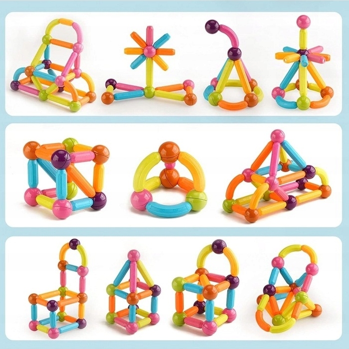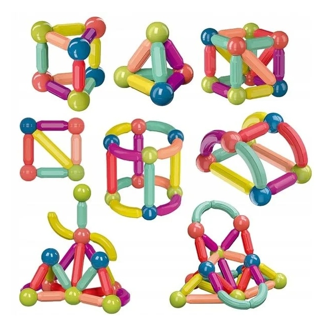 - В комплект входят 64 блока, 18 шариков, 22 маленьких цилиндрических блока, 16 больших цилиндрических блоков и 8 изогнутых блоков, которые можно собрать в 2D- или 3D-модели различной формы, которые можно использовать в магнитных играх.