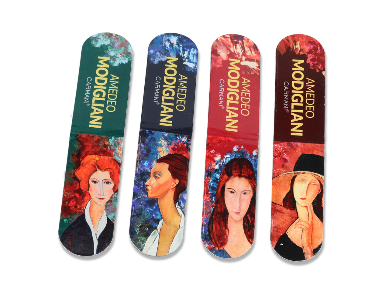 Набор из 4 магнитных закладок из серии картин Кармани. На каждой вкладке представлены работы Амедео Модильяни, такие как: «Женщина в шляпе», «Портрет Жанны», «Портрет Лунии Чеховской» и «Женщина с рыжими волосами». Закладки покрыты блестящей фольгой, которая защищает их от повреждений и придает мотивам глубину и элегантность. Благодаря магнитной застежке они прекрасно приклеиваются к страницам, не разрушая их и всегда оставаясь на своем месте. Размеры одной закладки: 5,4×2 см.
