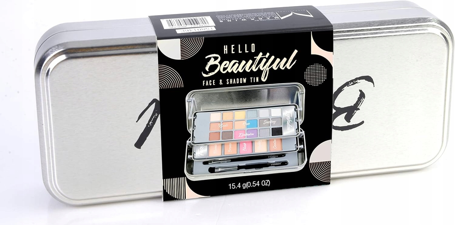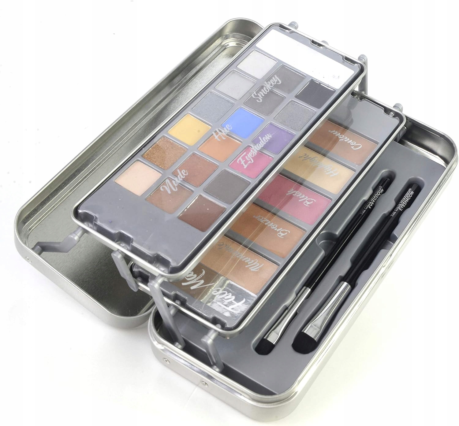 - НИЧЕГО. ОТСУТСТВУЕТ - Баночка в металлическом корпусе содержит 24 оттенка теней для веки, 3 оттенка бровей, контурирующая пудра, хайлайтер, бронзатор, румяна и 3 кисти для макияжа.