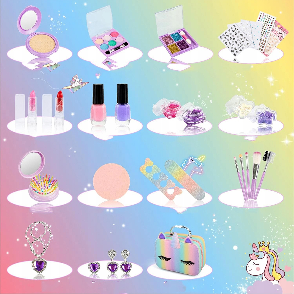 Веселье никогда не закончится. В этот красивый набор входит множество аксессуаров, таких как тени для век, красочные помады, лаки для ногтей и украшения для ногтей.