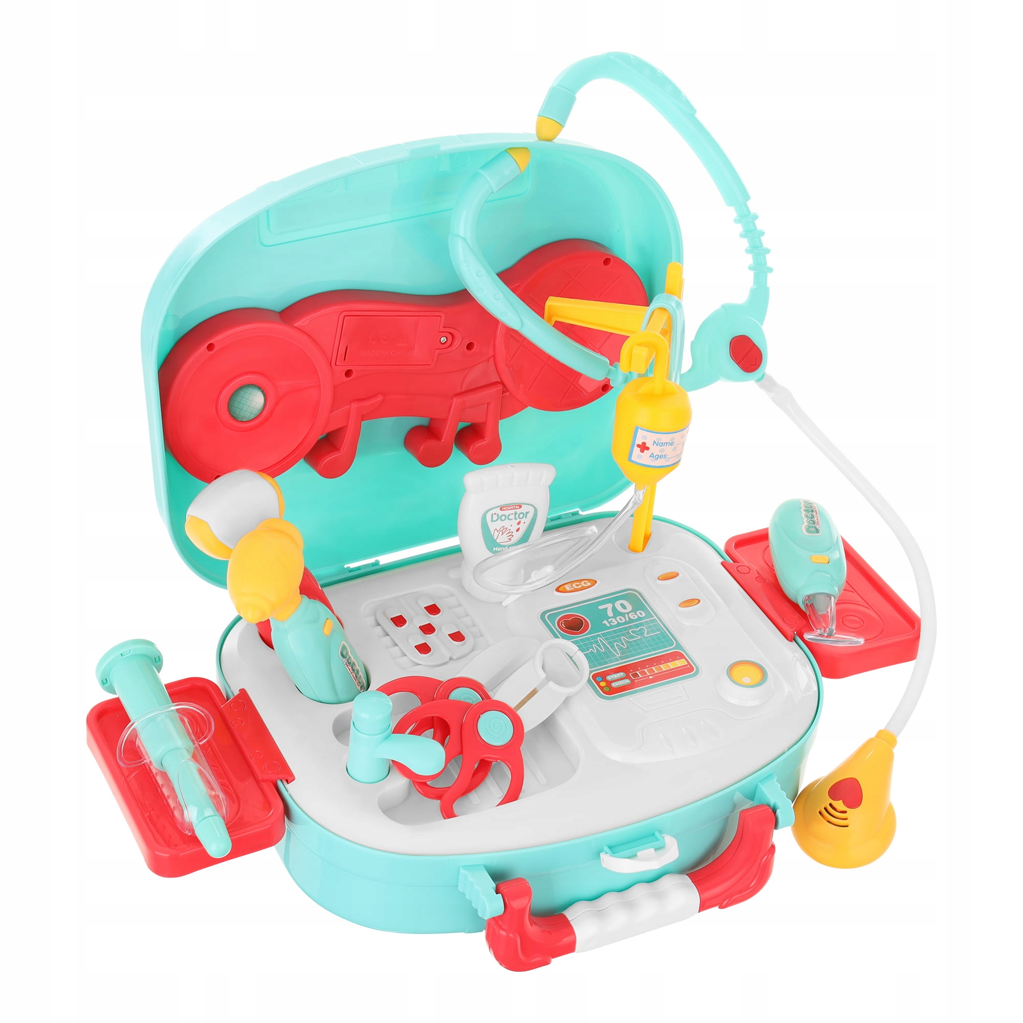 Стетоскоп, лекарства, шприц и молоток – это всего лишь мало необходимых вещей, которые есть в чемодане. Во время обследований малыш также может пользоваться экраном ЭКГ, а также всеми его ящиками и отделениями. Пусть ваш ребенок превратится в настоящего врача и узнает о его работе. Доставьте ему массу удовольствия!