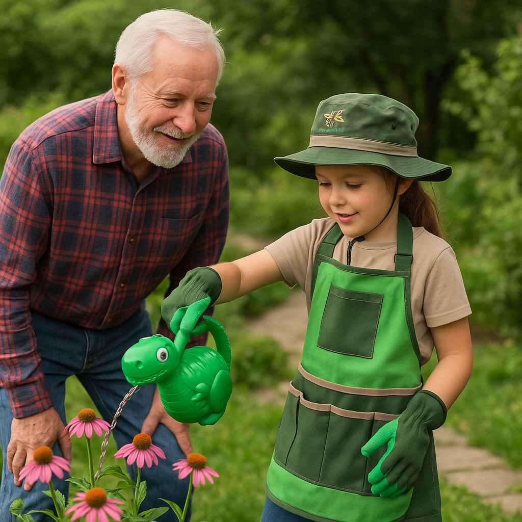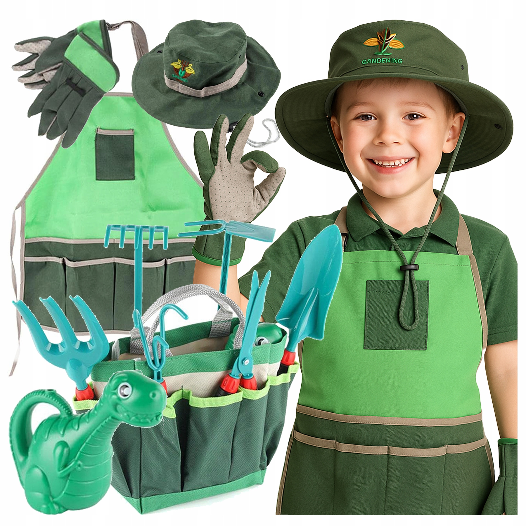 В комплект входит фартук с множеством карманов для инструментов, удобные перчатки для защиты рук и широкая шапка, защищающая голову ребенка от солнца.