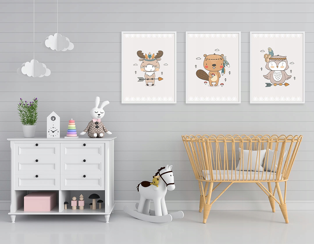 Это не только отличная идея оклеить пустые стены в детской комнате, но и персонализировать их, сделав картинки едиными своего рода. Плакаты – самый простой способ красиво украсить детскую комнату. Предлагаемый нами комплект выполнен в нейтральных тонах, поэтому впишется в любую композицию.