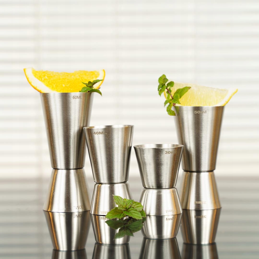 - набор из 4-х барменских мерных стаканчиков: 50/25 мл, 40/20 мл , 60/30 мл, 30/15 мл - эти 4 мерных стаканчика позволят вам отмерить все объемы ингредиентов, наиболее часто встречающихся в рецептах напитков.