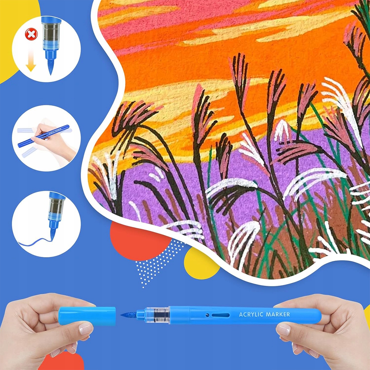 Каждый акриловый маркер оснащен гибким, износостойким кончиком кисточки из волокна, который плавно скользит по любой поверхности. Переменное давление и угол позволяют создавать как тонкие линии (1 мм), так и смелые штрихи (8 мм) — идеально подходят для создания сложных деталей и насыщенных цветов. Никаких ворсинок, засоров и разделения цветов.