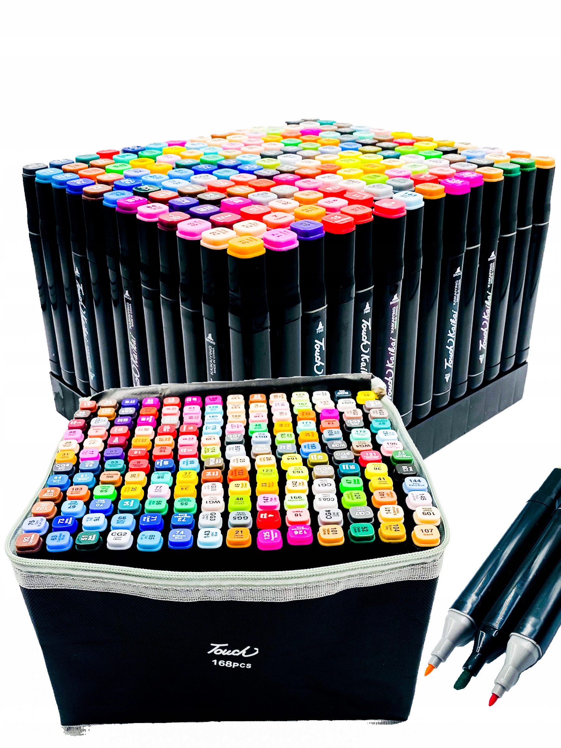 Отличные двусторонние маркеры доступны в 168 цветах. Они характеризуются красивым цветом и отличным покрытием поверхности. Они идеально подходят для рисования и покрытия больших поверхностей. Маркеры имеют два кончика: широкий и тонкий (острый). Наконечники изготовлены из устойчивого к истиранию материала, поэтому маркеры прослужат долго. Волокно на концах не расщепляется, не расслаивается и не протекает.