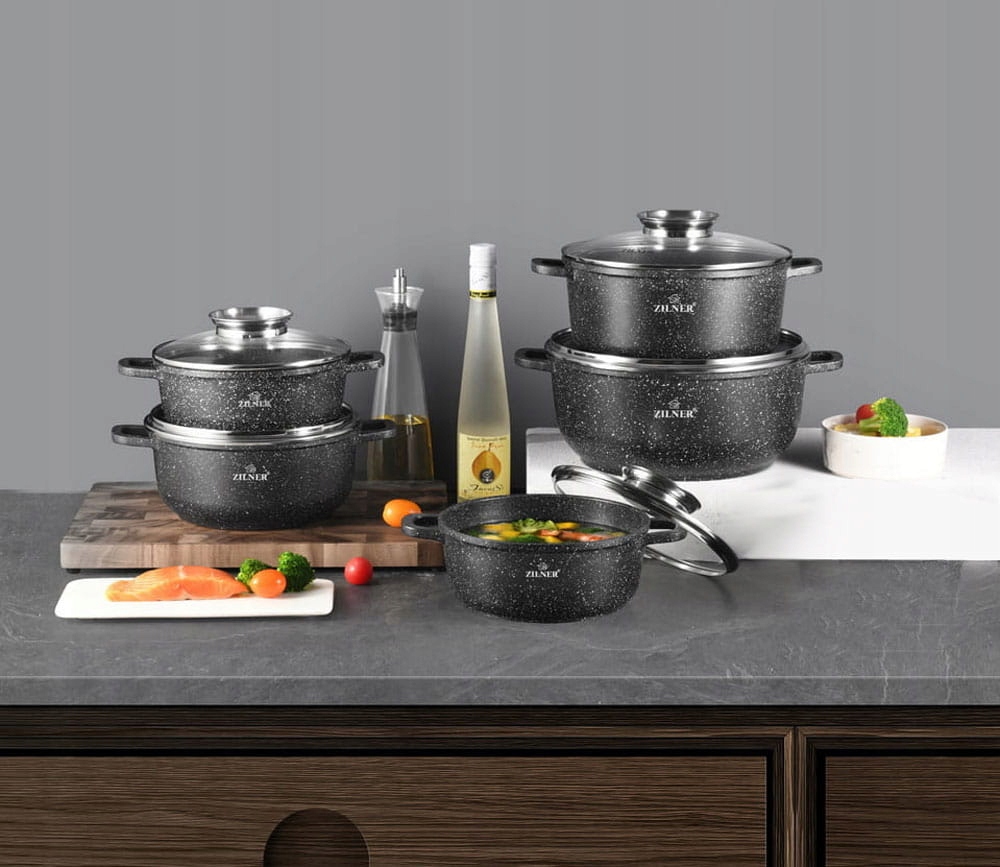 Набор мраморных кастрюль ZILNER – это надежная кухонная посуда, сочетающая в себе современный дизайн, функциональность и долговечность. Изготовленные из литого алюминия и покрытые мраморным антипригарным покрытием, они являются идеальным выбором для людей, которые ценят здоровое приготовление пищи и легкую очистку.