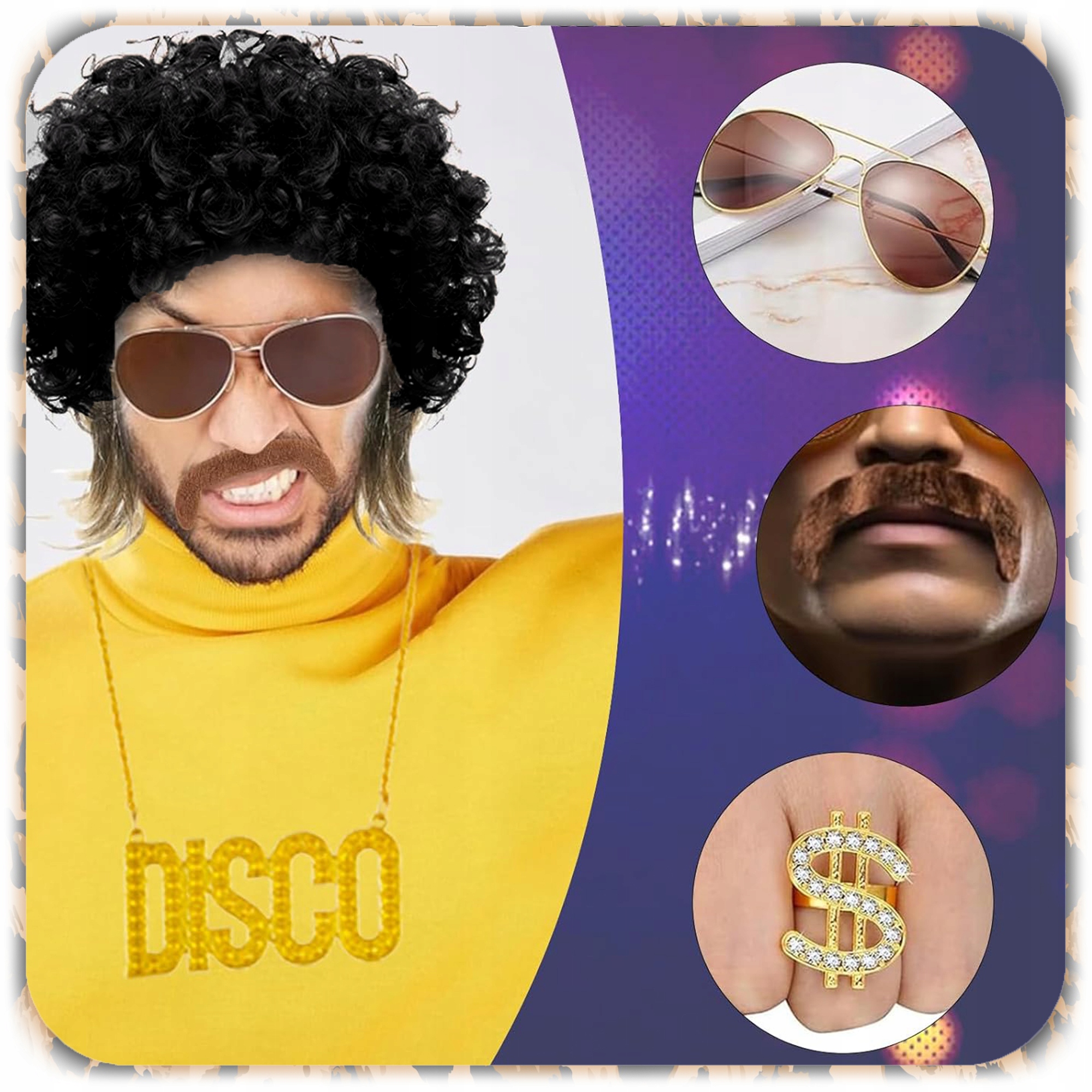 ✨ Сияй как звезда диско! Ретро-комплект с афро-париком, очками, золотой цепочкой и надписью «ДИСКО» - идеальный костюм для Хэллоуина, карнавалов и тематических вечеринок. Стиль, крутость и атмосфера 80-х в одном комплекте!