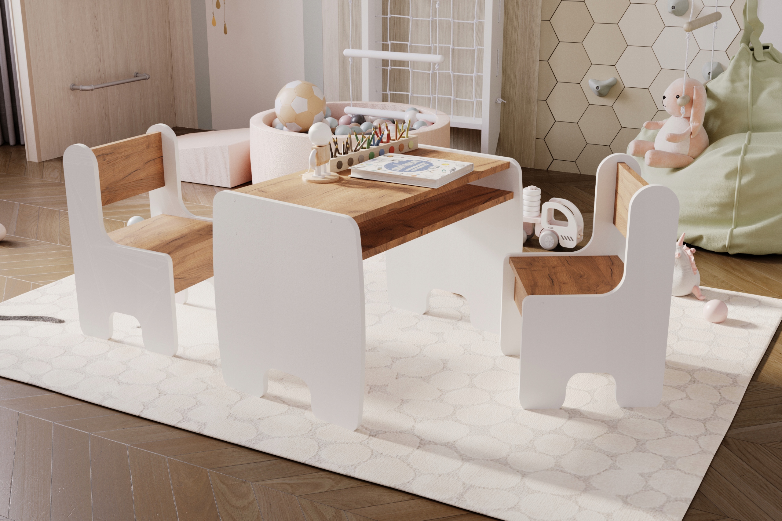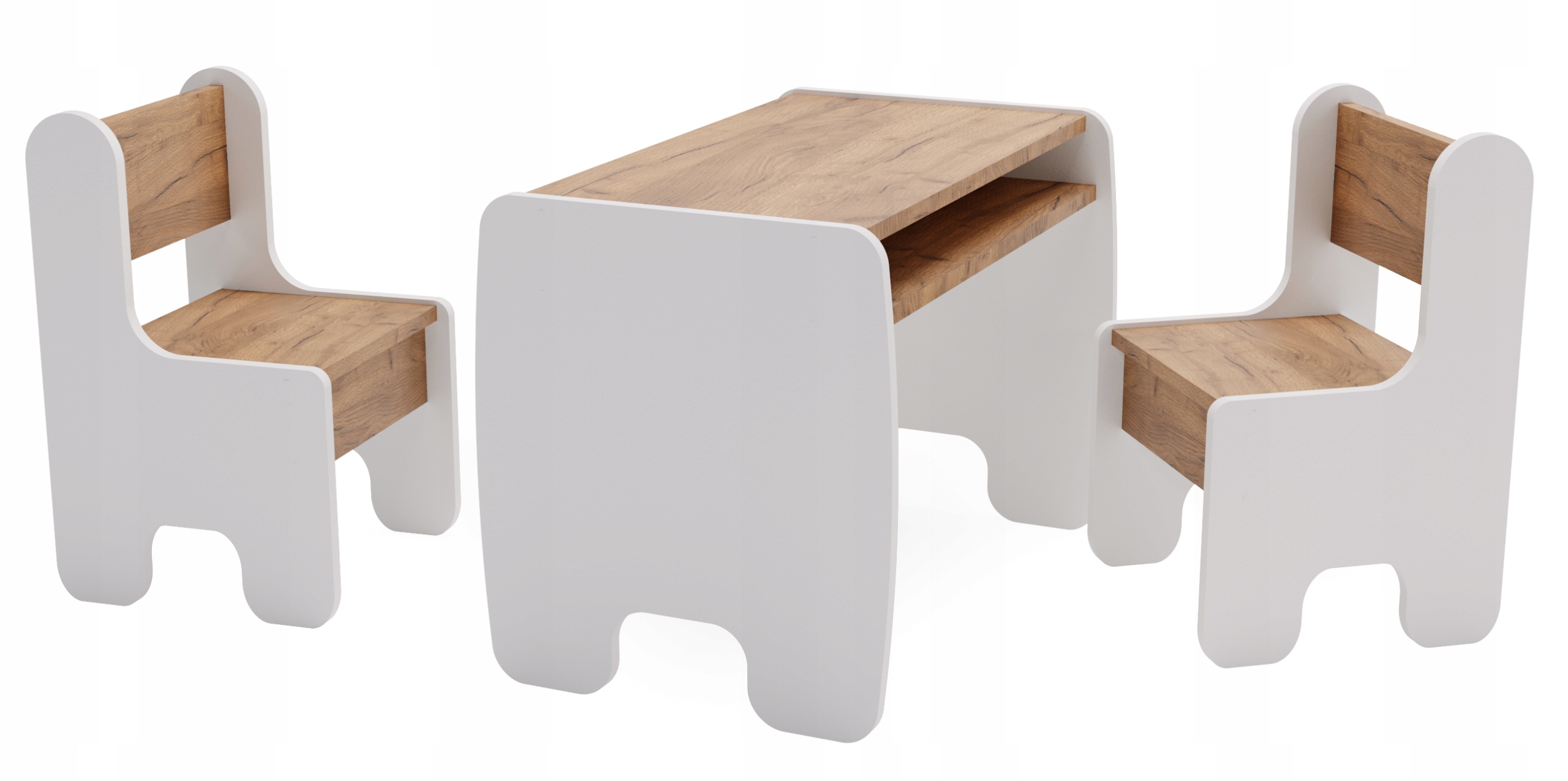 Комплект мебели детский стол и два стульчика – чрезвычайно практичное и креативное решение, прекрасно вписывающееся в обустройство детской комнаты. Идеальная мебель, отвечающая потребностям ребенка – для обучения, рисования или игр. Прочная конструкция из высококачественного ламинированного мебельного щита обеспечивает долговечность, а закругленные края с резиновым ободом обеспечивают безопасность во время каждой игры. Под столешницей имеется просторное место для хранения, поэтому дети могут удобно организовать свои предметы, такие как книги, ручки, кубики и игрушки. Такое решение помогает поддерживать порядок в комнате и гарантирует, что все необходимые вещи всегда будут под рукой.