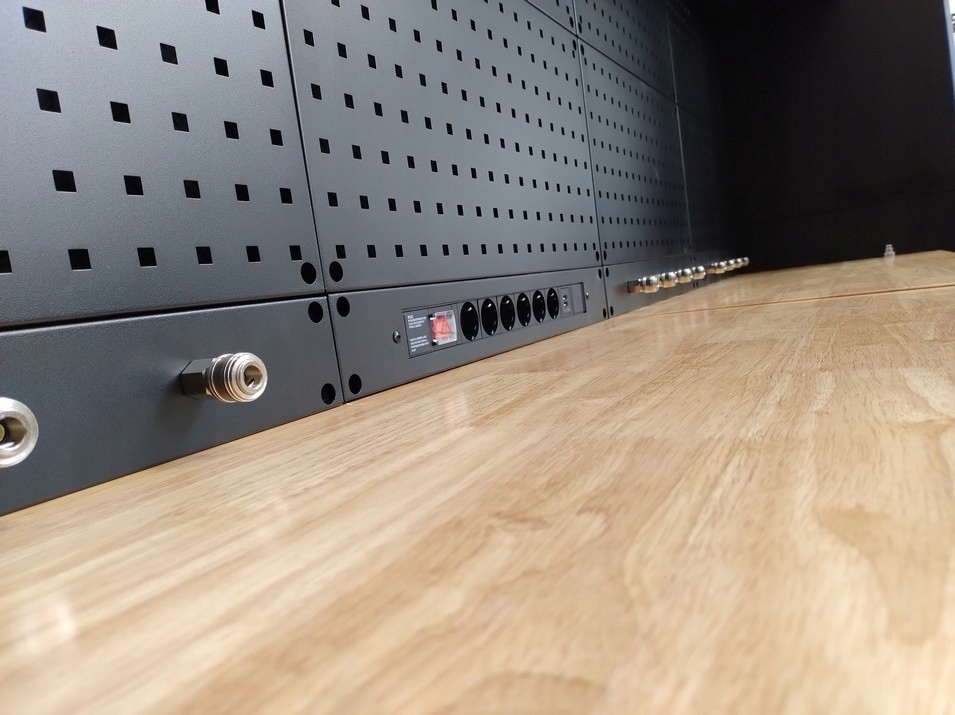 - 16 соединительных розеток для пневматических инструментов непосредственно над столешницей столешница.