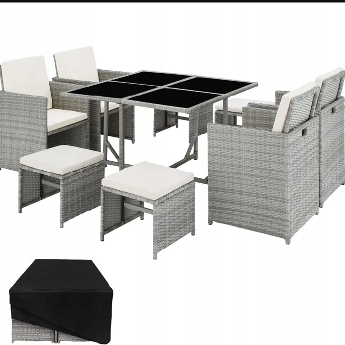 Использованный материал – техноротанг – был разработан специально для садовой мебели. Техноратанг – это общий термин, обозначающий тканый материал из полиэтилена, который является промышленно изготовленной альтернативой натуральному ротангу. Таким образом, ваш новый комплект мебели для гостиной можно мыть, легко чистить и он устойчив к погодным условиям. Мягкие подушки водонепроницаемы и легко снимаются благодаря вшитым молниям. Верхняя часть из закаленного стекла окрашена с нижней стороны в черный цвет, что придает ей благородный вид. Стулья можно легко и легко перемещать благодаря выемкам по бокам. Благодаря складной спинке стулья и табуреты можно собрать в модульную систему. Входящий в комплект чехол обеспечивает дополнительную защиту и продлевает срок службы этого замечательного набора для отдыха.