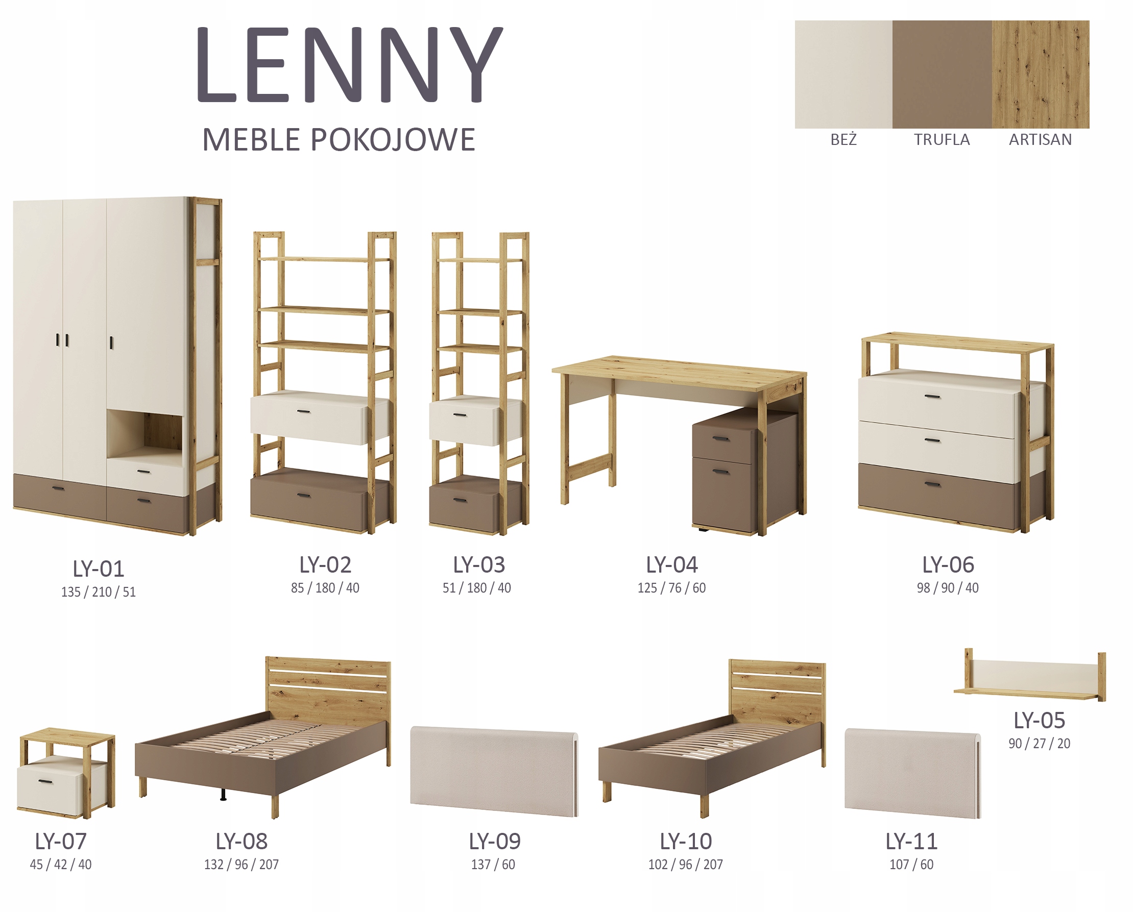 Вы ищете идеальную молодежную мебель, в которой не только поместится вся одежда и предметы вашего ребенка, но и также станет стильным дополнением комнаты? Наш шкаф для комнаты подростка из коллекции LENNY – это не просто обычный предмет мебели для подростка. Это функциональное решение, которое обеспечит вашему ребенку идеальное место для хранения и организации своих вещей. Мы предоставим необходимое количество полок и ящиков, чтобы ваш ребенок мог легко сортировать свою одежду, обувь, аксессуары и многое другое. Тонкое и в то же время универсальное сочетание декора бежевого, трюфельного и ремесленного дуба позволяет мебели идеально вписаться как в комнату девочек, так и в комнату мальчиков, независимо от их возраста. Не медлите! Позвольте вашему ребенку насладиться идеальным решением для хранения и организации своих вещей.