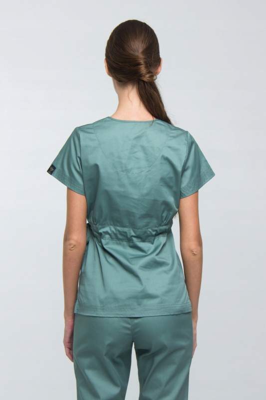 Костюм женский хирургический. Конверт вырезан в верхней части блузки. Короткий рукав. Боковые разрезы. На талии имеется шнурок, позволяющий регулировать посадку топа по талии. Рукав, карманы и низ топа декорированы четырехрядной строчкой. Брюки прямого кроя с двумя накладными карманами. В талии они регулируются резинкой и лентой.