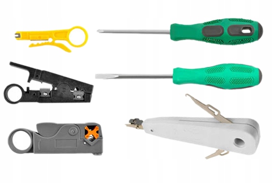 Стриппер, позволяет безопасно снимать изоляцию с проводов различной толщины. Он оснащен резаком и съемником. В комплект также входит толкатель для кабелей с разъемами LSA; две отвертки – плоская и крестовая, необходимые при выполнении мелкого ремонта кабелей; два инструмента для резки и изоляции проводов, без них не может обойтись ни один профессионал.