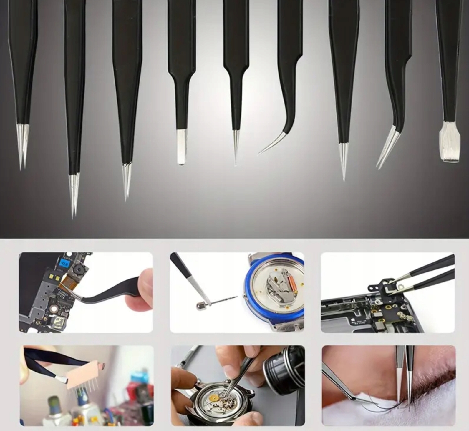 - Набор из 9 прямых и косых пинцетов для сервисного обслуживания и моделирования.