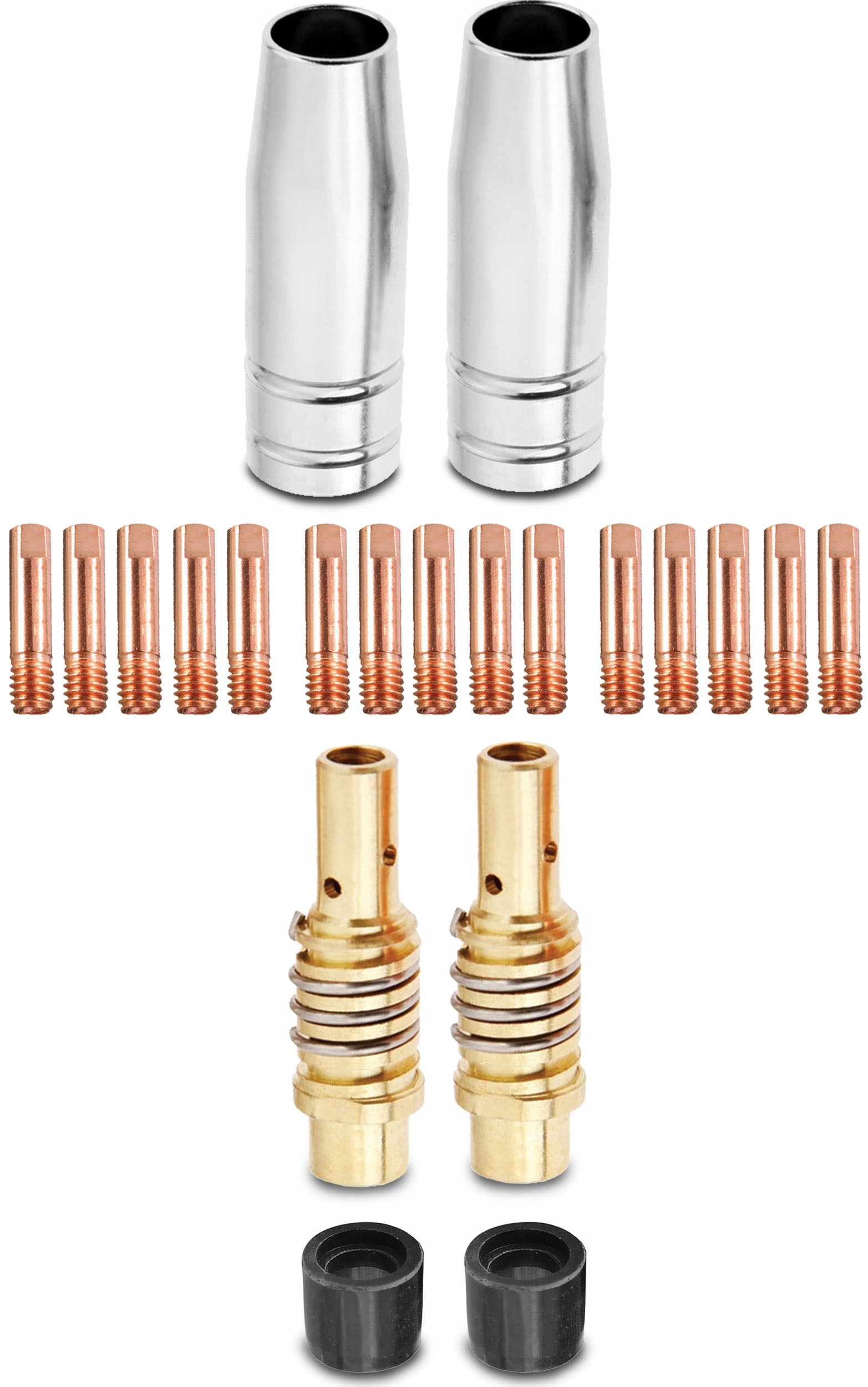 Набор основных элементов, необходимых для оснащения каждой сварочной горелки MIG/MAG стандартом MB 15. Выбранные элементы позволят сваривать сталь, алюминий и нержавеющую сталь.