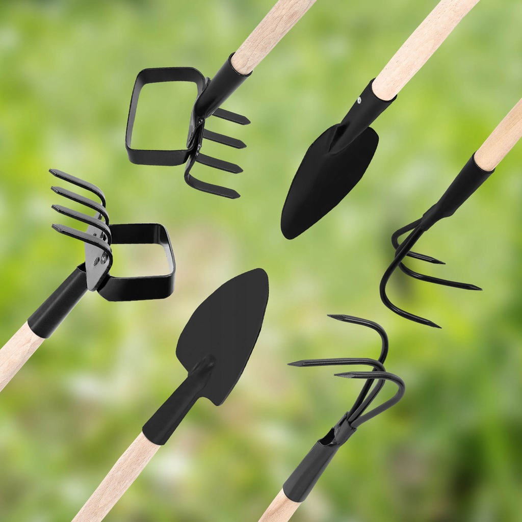 - Набор из 6 инструментов: вилы, когти, грабли с рубанком, лопаточка, тяпка с вилами, прямоугольная тяпка.