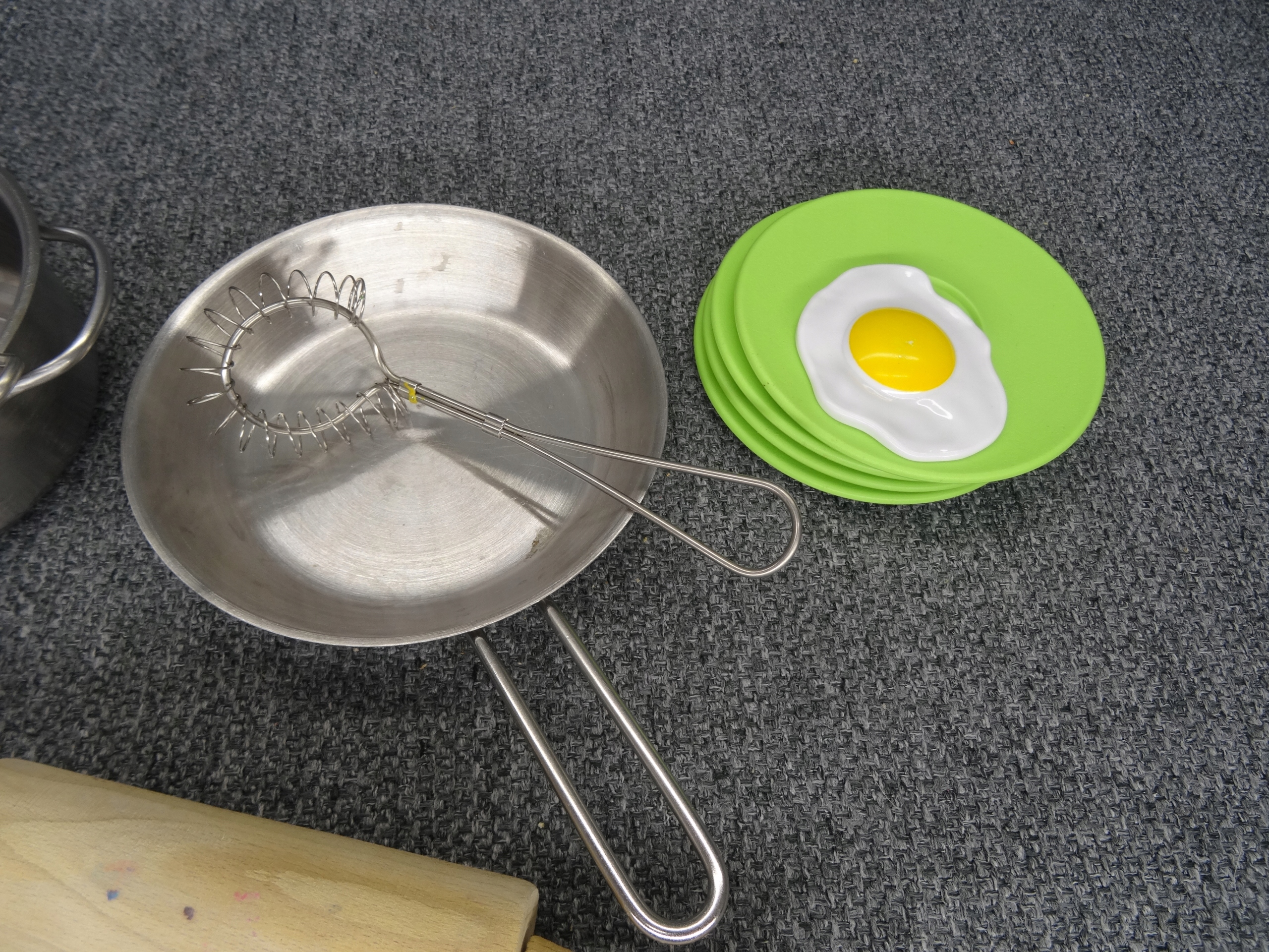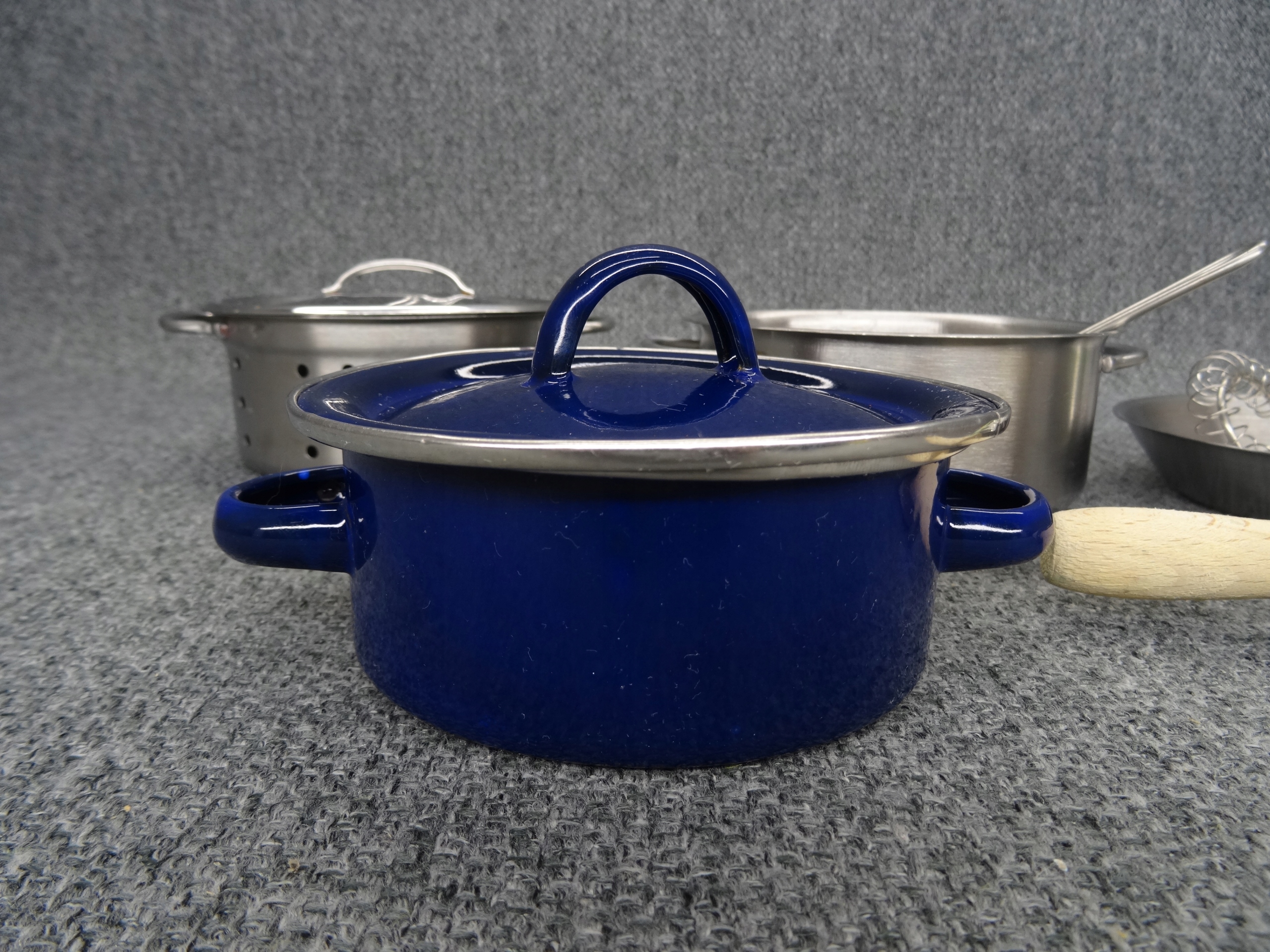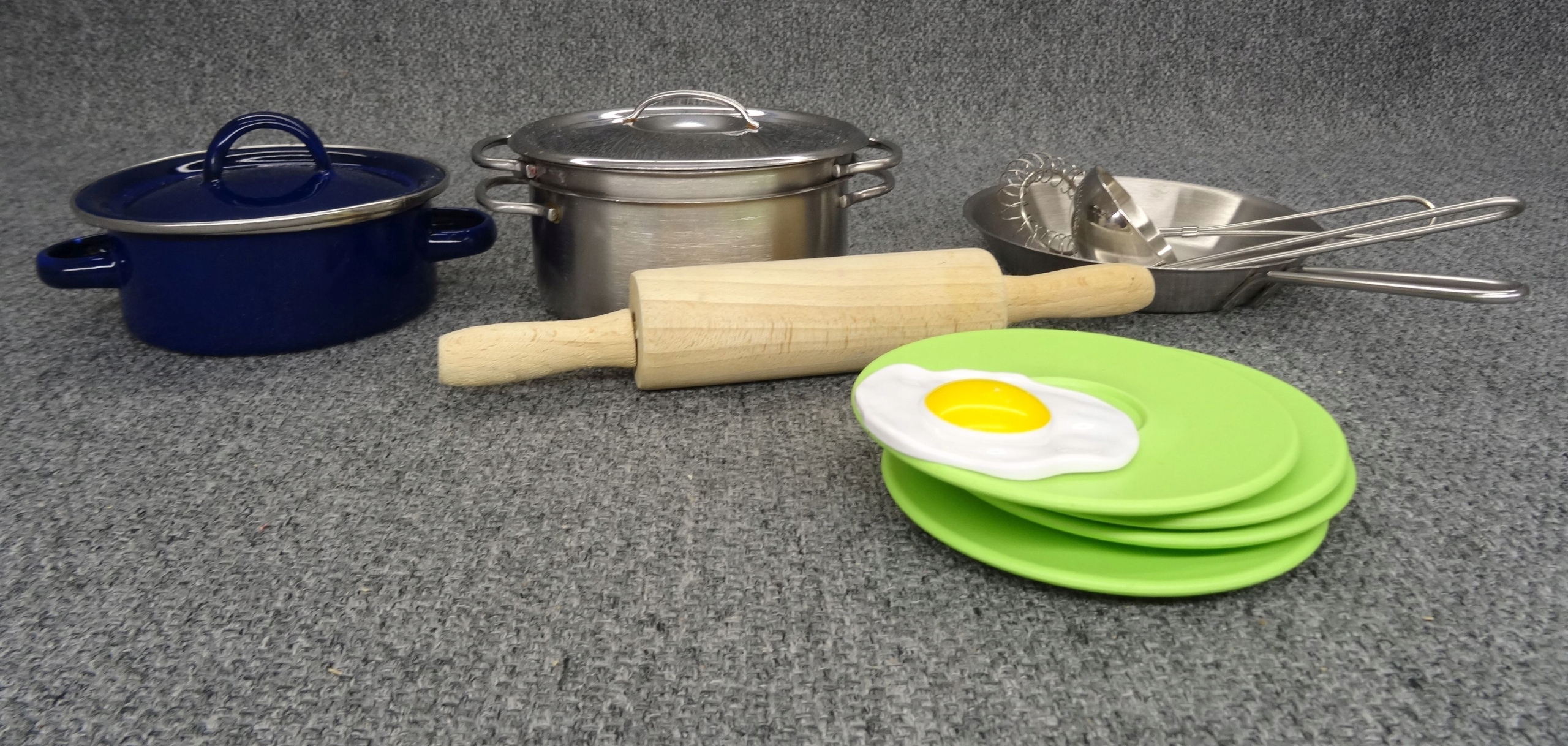 Набор миниатюрных игрушек, выполненных как настоящие: металлические кастрюли, эмалированная кастрюля, сковорода, ложка, скалка, тарелки + яичница