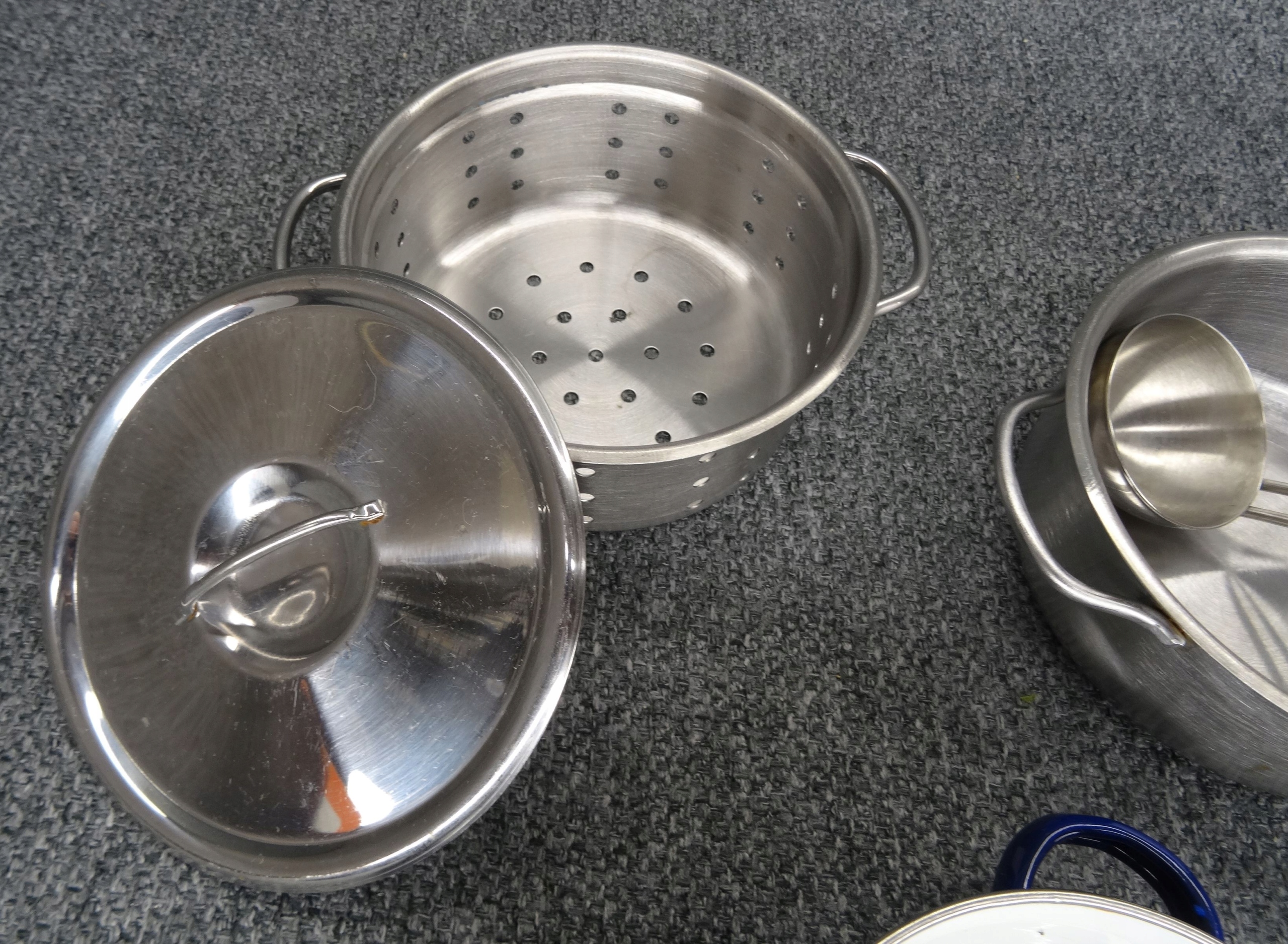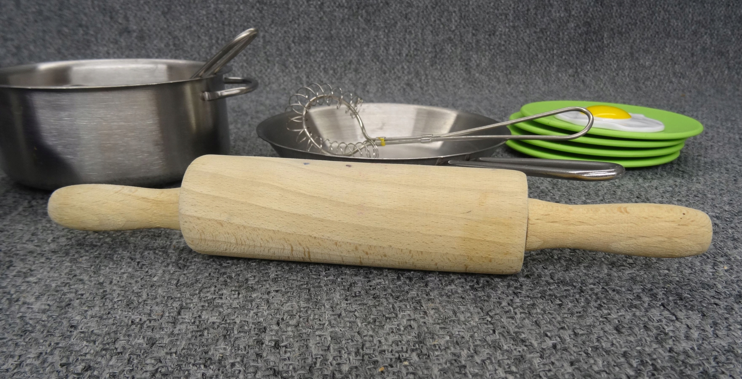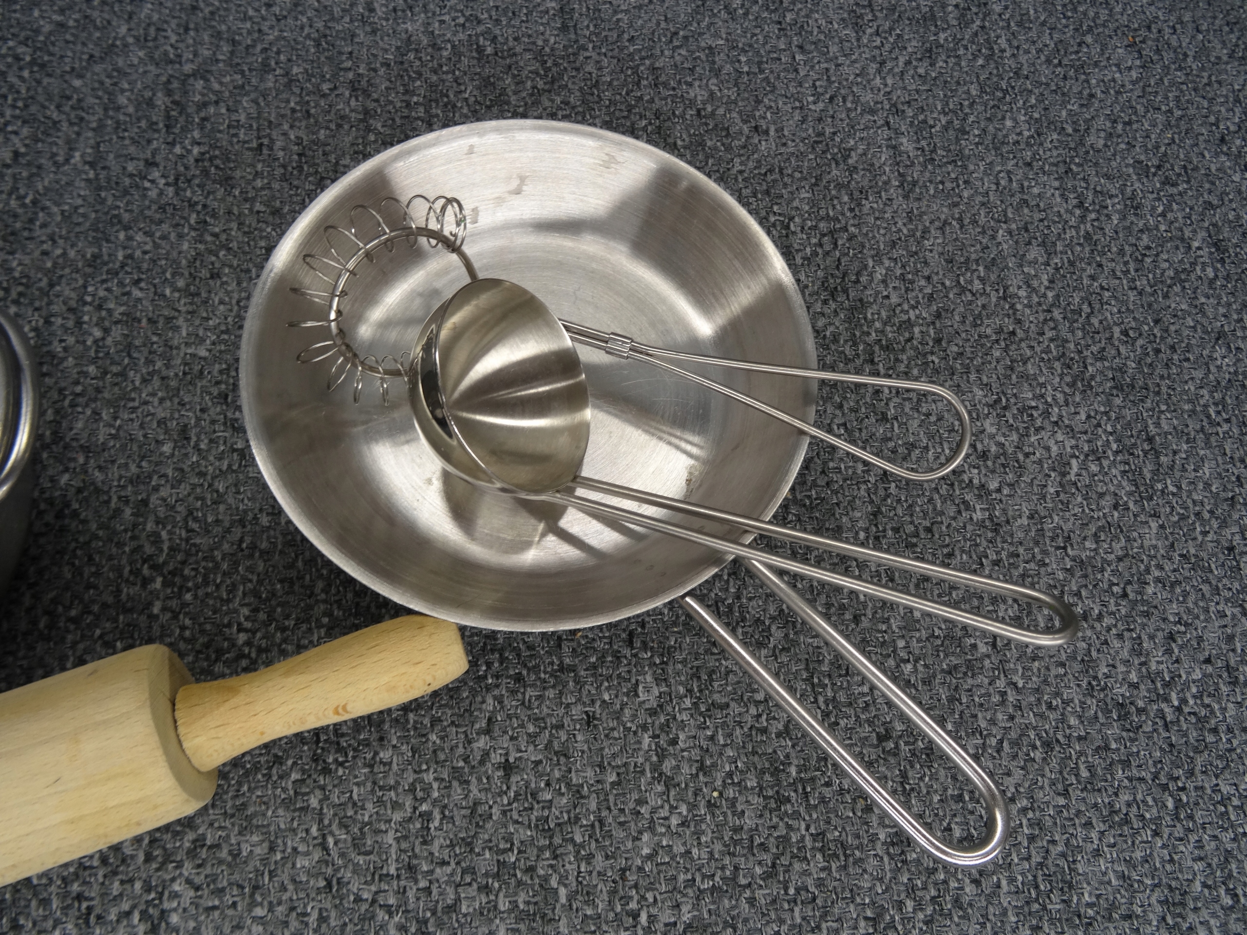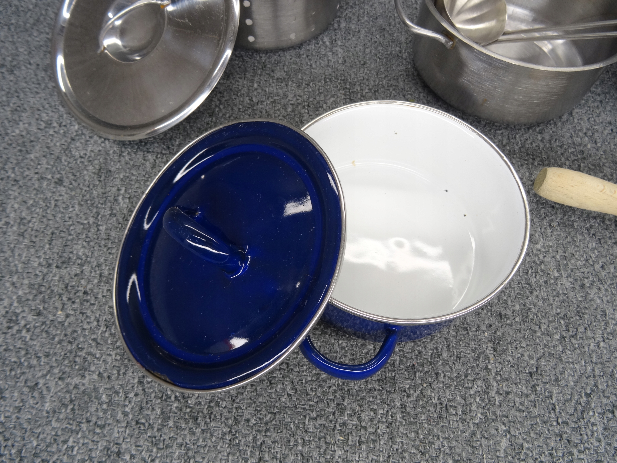 Набор миниатюрных игрушек, выполненных как настоящие: металлические кастрюли, эмалированная кастрюля, сковорода, ложка, скалка, тарелки + яичница